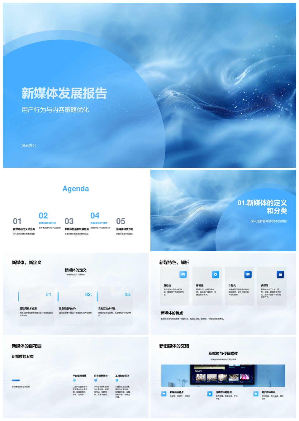 风云办公提供的新媒体用户行为内容策略发展趋势报告PPT模板,下载格式为pptx,一共33页,作品中文字及图均可以修改和编辑,图片更改请在作品中右键图片并更换,文字修改请直接点击文字进行修改。