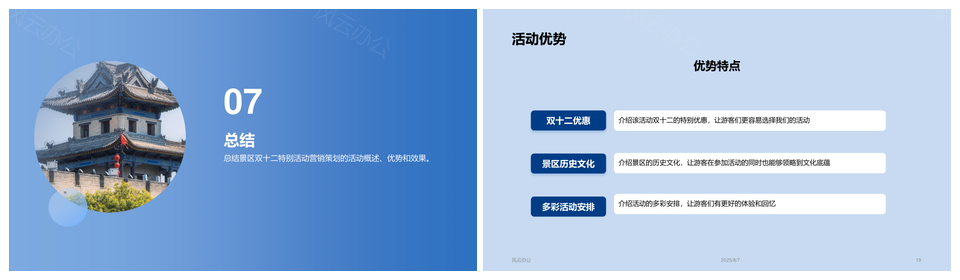 这是一张蓝色西安古城墙文化CTR商务活动营销策划PPT模板,包含蓝色、西安、古城墙、文化、CTR、商务活动、营销策划等主题内容,也可用作蓝色西安古城墙文化、西安古城墙文化CTR、古城墙文化CTR商务活动、文化CTR商务活动营销策划、蓝色西安古城墙、西安古城墙文化、古城墙文化CTR、文化CTR商务活动、CTR商务活动营销策划、蓝色西安、西安古城墙、古城墙文化、文化CTR、CTR商务活动、商务活动营销策划等PPT场景使用。 风云办公提供的蓝色西安古城墙文化CTR商务活动营销策划PPT模板,下载格式为pptx,一共20页,作品中文字及图均可以修改和编辑,图片更改请在作品中右键图片并更换,文字修改请直接点击文字进行修改。
