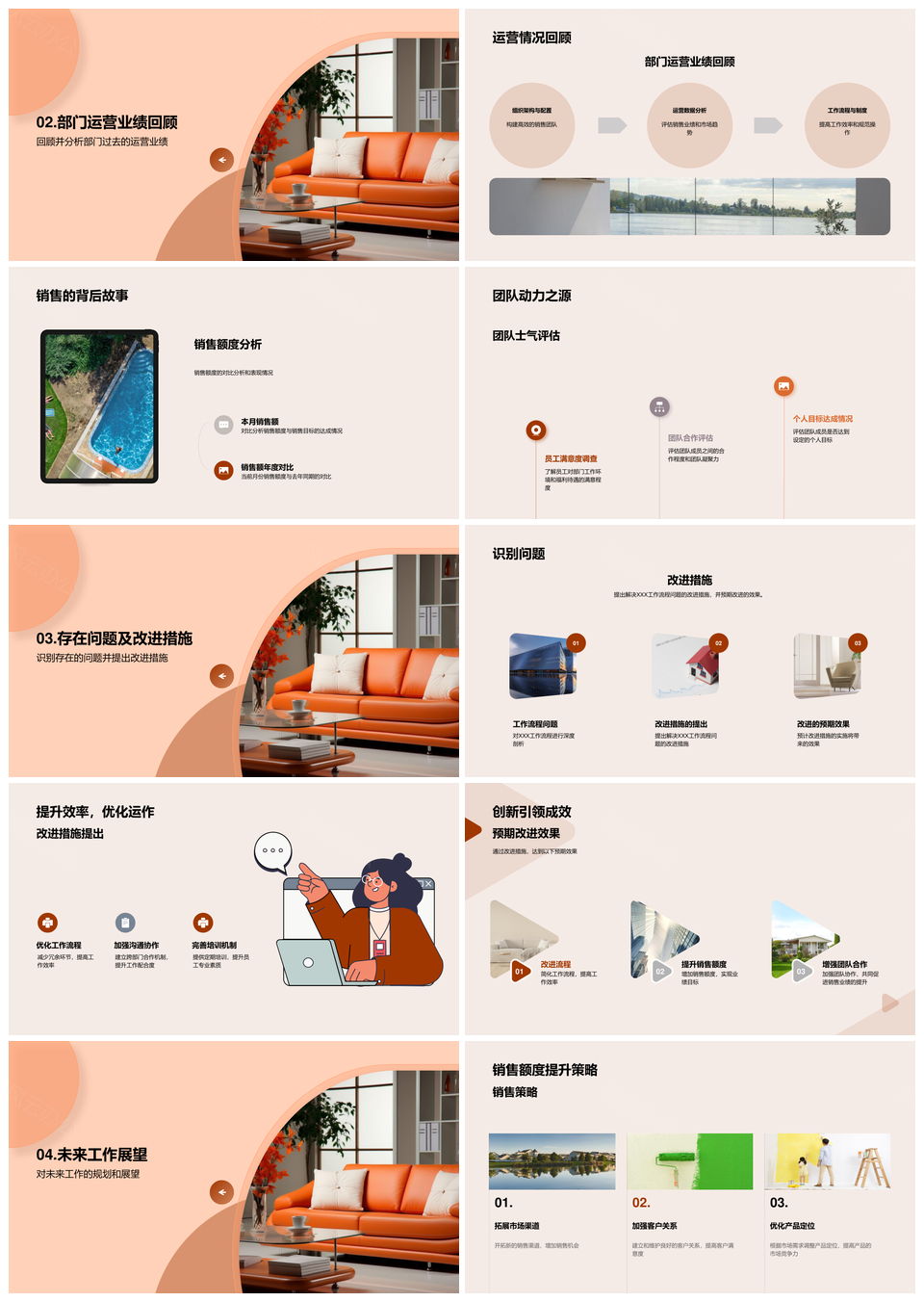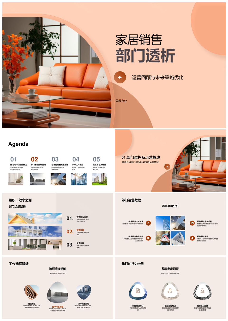 这是一张家居销售部门业绩分析流程制度团队策略优化PPT模板,包含家居、销售部门、业绩分析、流程、制度、团队、策略、优化等主题内容,也可用作家居销售部门业绩分析流程、销售部门业绩分析流程制度、部门业绩分析流程制度团队、业绩分析流程制度团队策略、分析流程制度团队策略优化、流程制度团队策略优化、家居销售部门业绩分析、销售部门业绩分析流程、部门业绩分析流程制度、业绩分析流程制度团队、分析流程制度团队策略、流程制度团队策略优化、制度团队策略优化、团队策略优化、策略优化等PPT场景使用。 风云办公提供的家居销售部门业绩分析流程制度团队策略优化PPT模板,下载格式为pptx,一共24页,作品中文字及图均可以修改和编辑,图片更改请在作品中右键图片并更换,文字修改请直接点击文字进行修改。