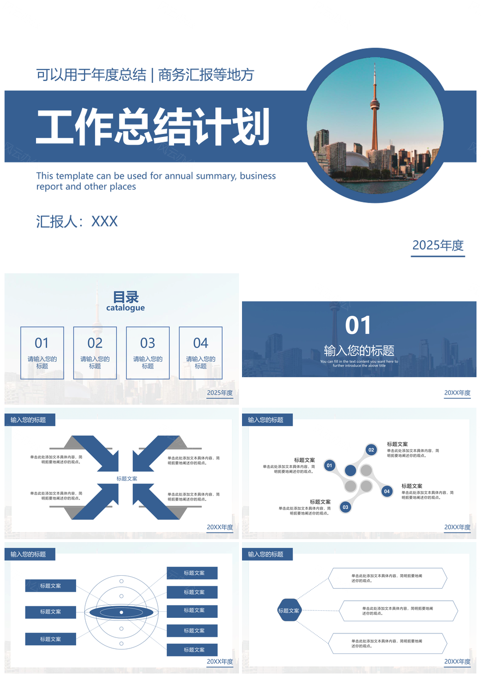 2025蓝几何城市风景商务塔简约总结PPT模板
