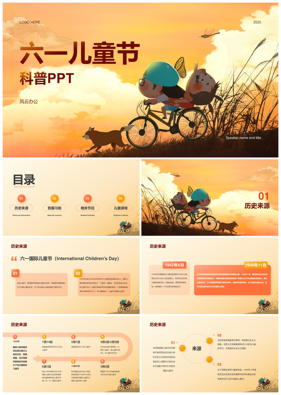 2025橙色插画卡通六一儿童节科普教育PPT模板