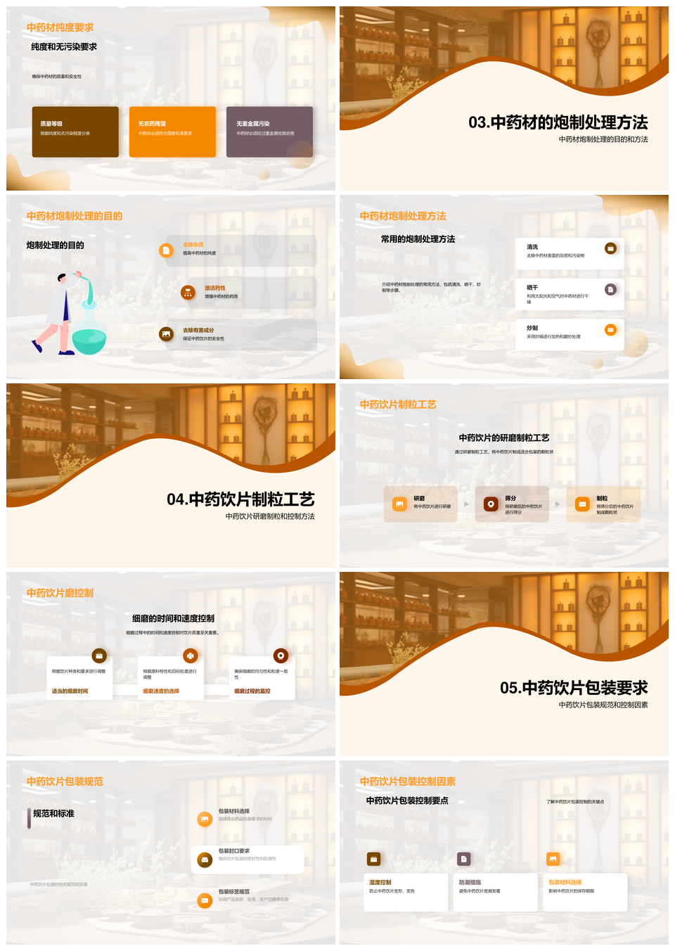 这是一张中药饮片加工全流程采集炮制制粒包装PPT模板,包含中药饮片、加工、全流程、采集、炮制、制粒、包装等主题内容,也可用作中药饮片加工全流程采集、加工全流程采集炮制、全流程采集炮制制粒、采集炮制制粒包装、中药饮片加工全流程、加工全流程采集、全流程采集炮制、采集炮制制粒、炮制制粒包装、中药饮片加工、加工全流程、全流程采集、采集炮制、炮制制粒、制粒包装等PPT场景使用。