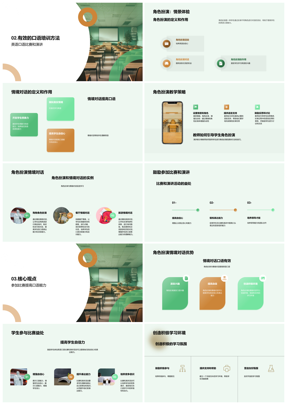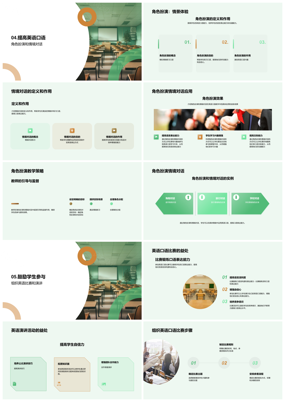 这是一张小学生英语口语角色扮演情境比赛演讲教学PPT模板,包含小学生、英语、口语、角色扮演、情境、比赛、演讲、教学等主题内容,也可用作小学生英语口语角色扮演、英语口语角色扮演情境、口语角色扮演情境比赛、角色扮演情境比赛演讲、情境比赛演讲教学、英语口语角色扮演、口语角色扮演情境、角色扮演情境比赛、情境比赛演讲、比赛演讲教学、小学生英语、英语口语、口语角色扮演、角色扮演情境、情境比赛等PPT场景使用。 风云办公提供的小学生英语口语角色扮演情境比赛演讲教学PPT模板,下载格式为pptx,一共33页,作品中文字及图均可以修改和编辑,图片更改请在作品中右键图片并更换,文字修改请直接点击文字进行修改。