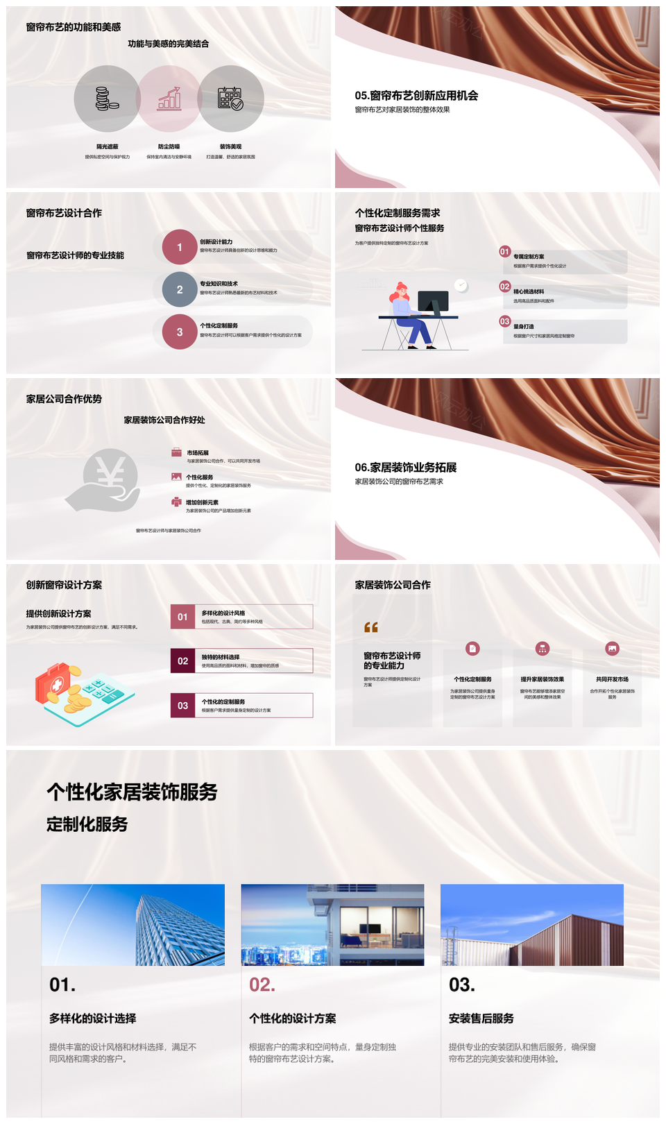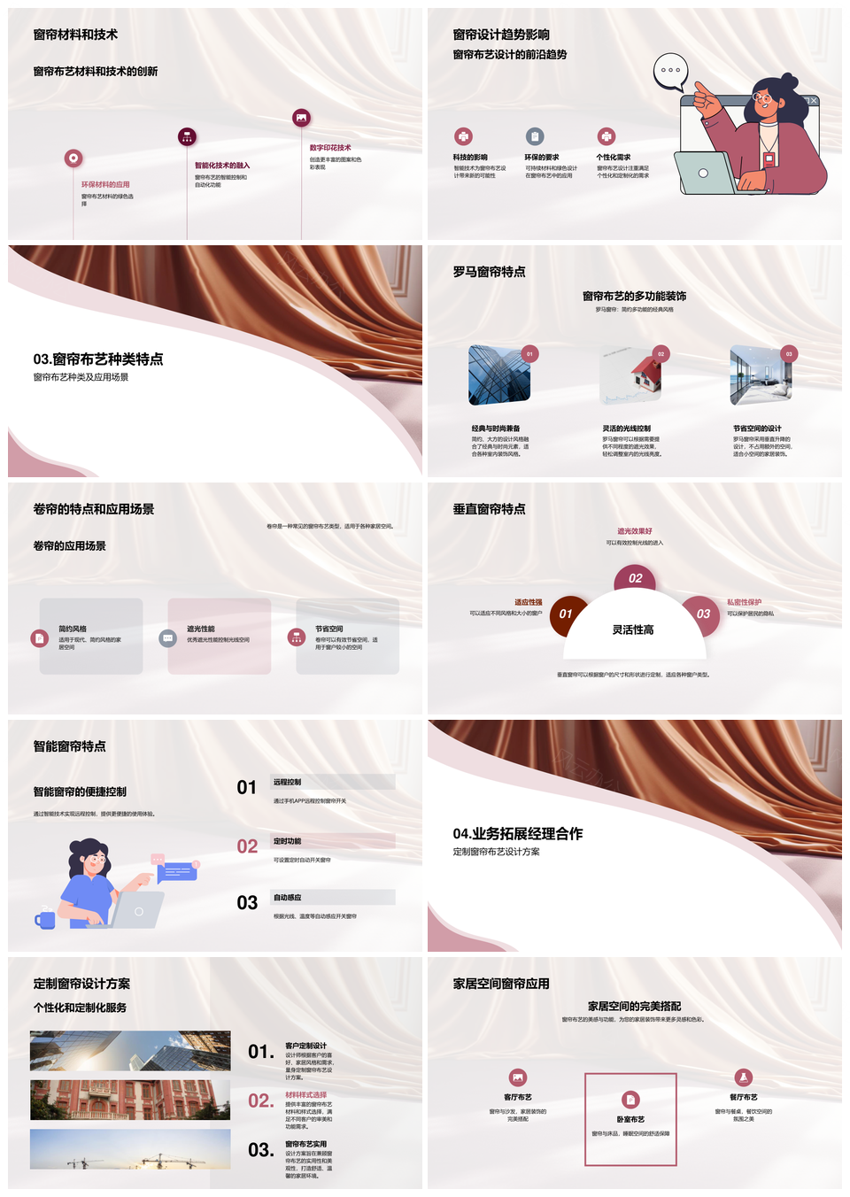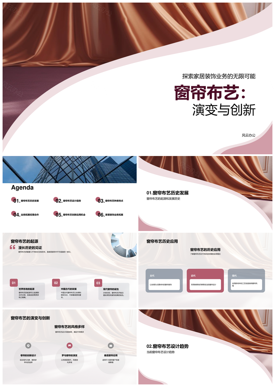 风云办公提供的窗帘布艺设计趋势与创新应用PPT模板,下载格式为pptx,一共27页,作品中文字及图均可以修改和编辑,图片更改请在作品中右键图片并更换,文字修改请直接点击文字进行修改。