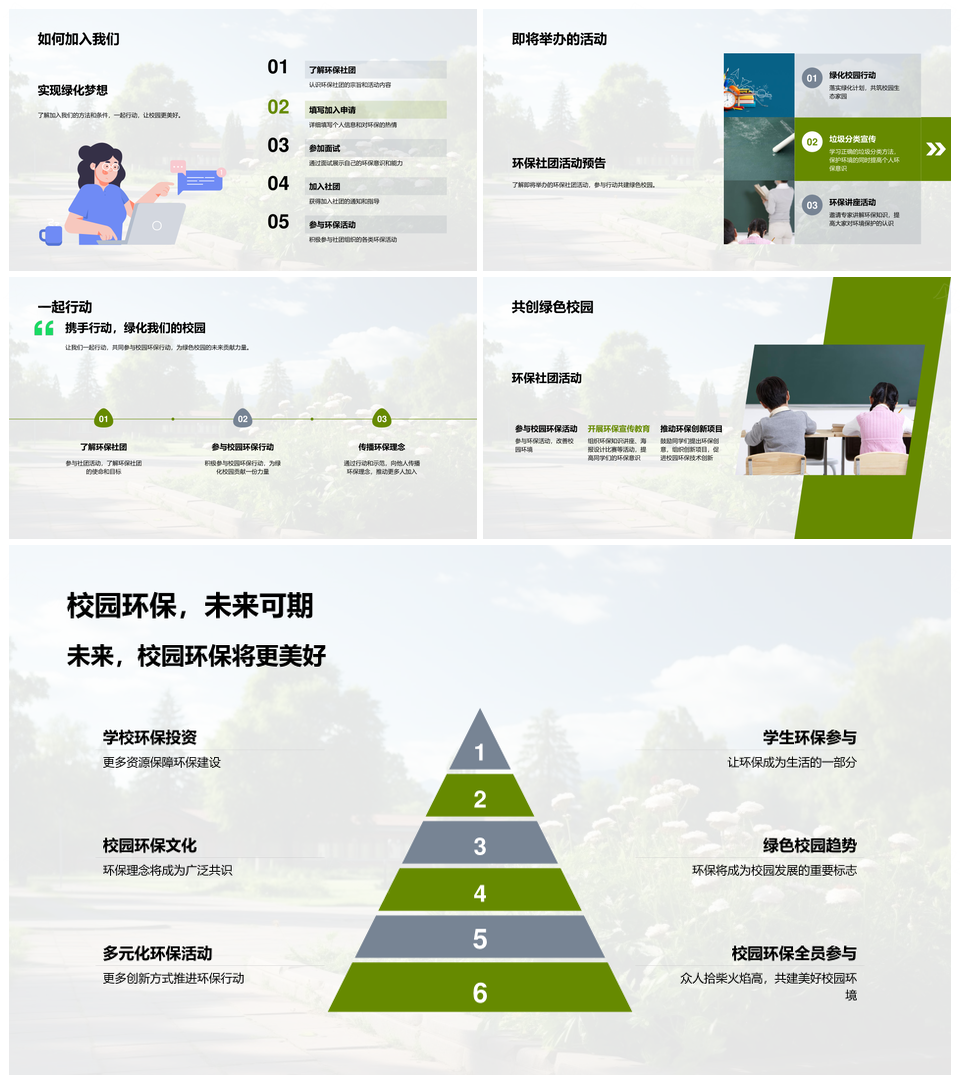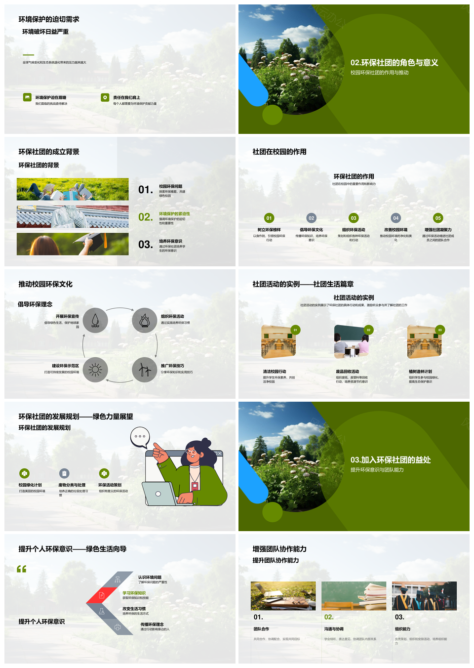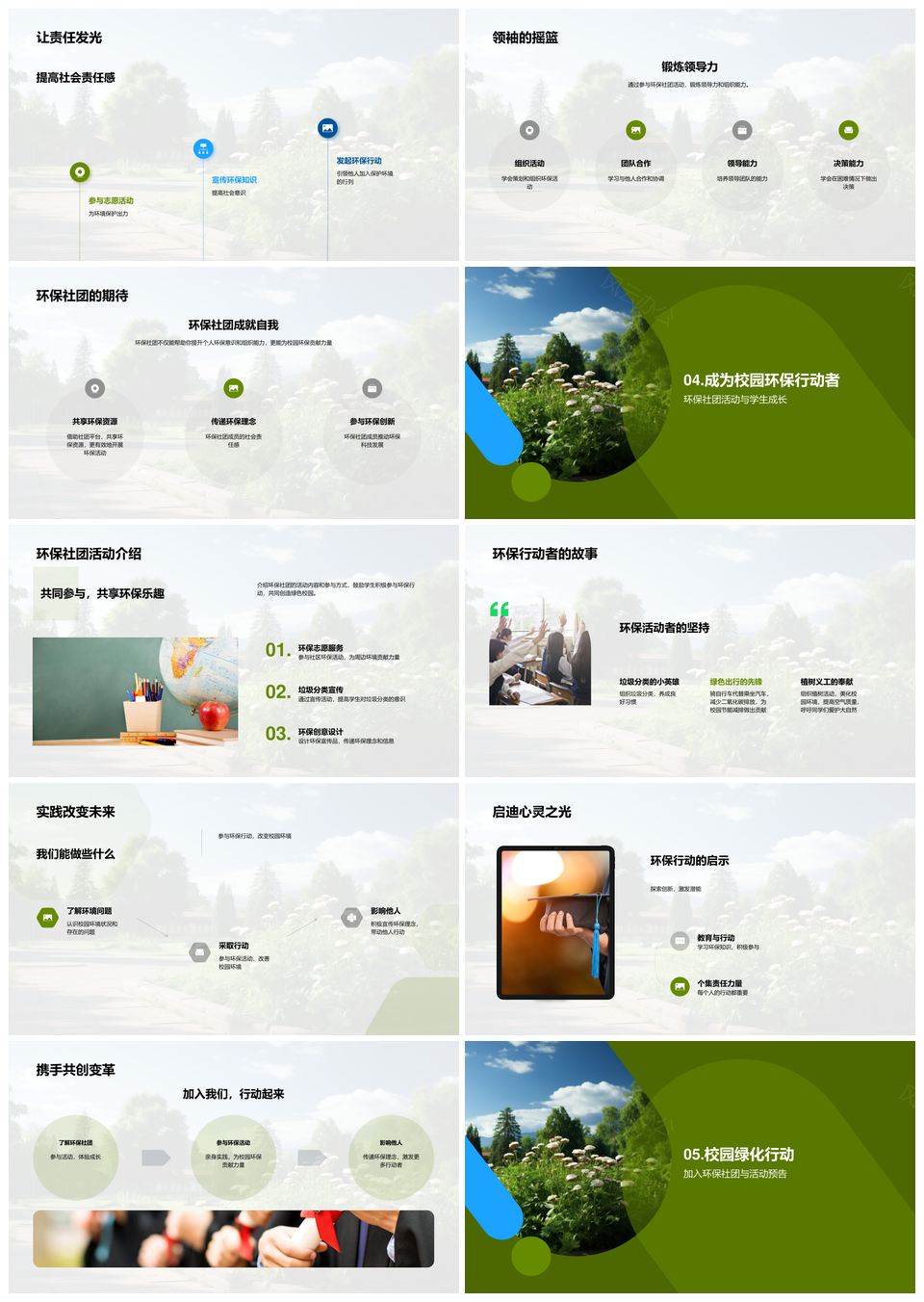 这是一张校园绿色行动环保教育社团共建绿化校园PPT模板,包含校园、绿色行动、环保教育、社团、共建、绿化等主题内容,也可用作校园绿色行动环保、绿色行动环保教育、行动环保教育社团、环保教育社团共建、教育社团共建绿化、社团共建绿化校园、校园绿色行动、绿色行动环保、行动环保教育、环保教育社团、教育社团共建、社团共建绿化、共建绿化校园、校园绿色、绿色行动等PPT场景使用。 风云办公提供的校园绿色行动环保教育社团共建绿化校园PPT模板,下载格式为pptx,一共33页,作品中文字及图均可以修改和编辑,图片更改请在作品中右键图片并更换,文字修改请直接点击文字进行修改。