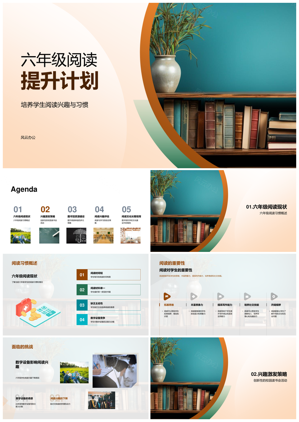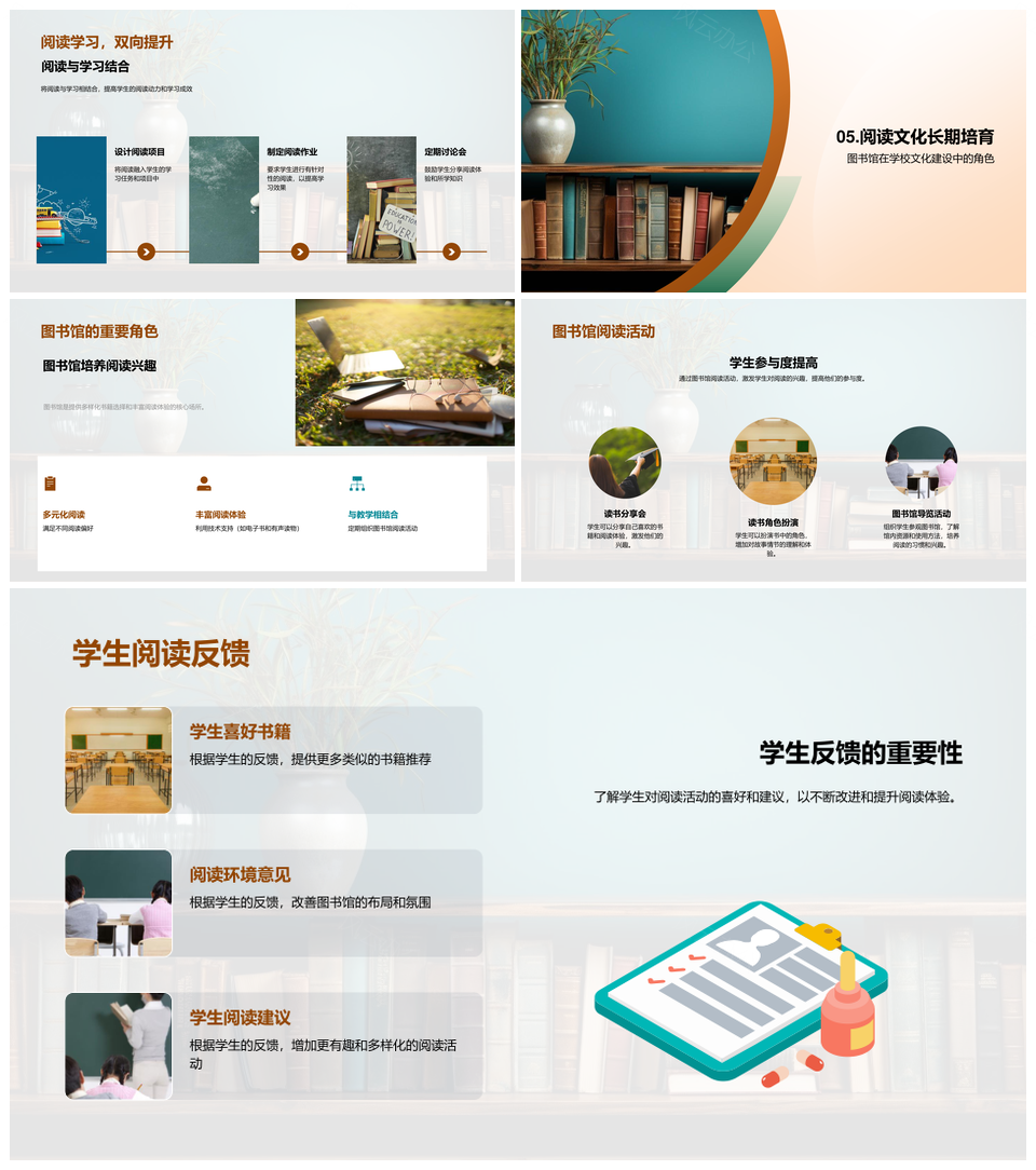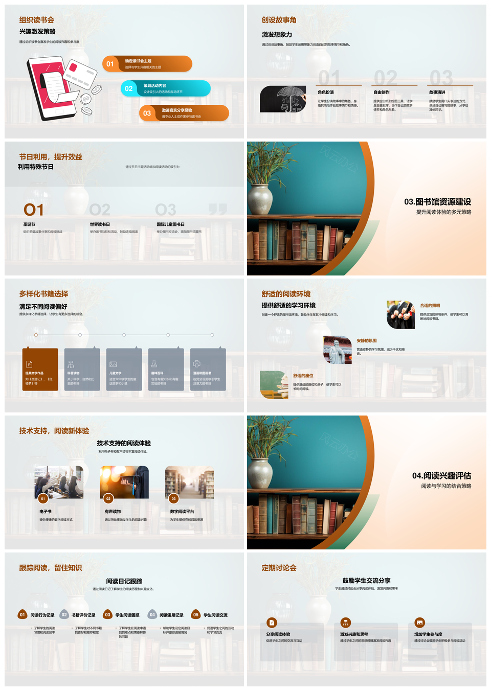 六年级阅读提升计划培养兴趣习惯读书会故事角节日多样书籍环境书架PPT模板推荐