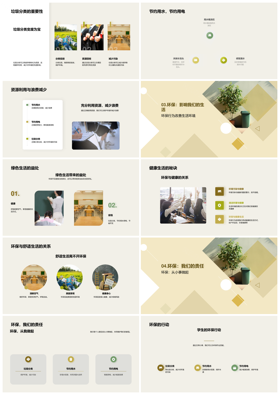 这是一张绿色生活美好校园践行环保节约分类PPT模板,包含绿色生活、美好校园、践行、环保、节约、分类等主题内容,也可用作绿色生活美好校园践行环保、美好校园践行环保节约、践行环保节约分类、绿色生活美好校园践行、美好校园践行环保、践行环保节约、环保节约分类、绿色生活美好校园、美好校园践行、践行环保、环保节约、节约分类等PPT场景使用。