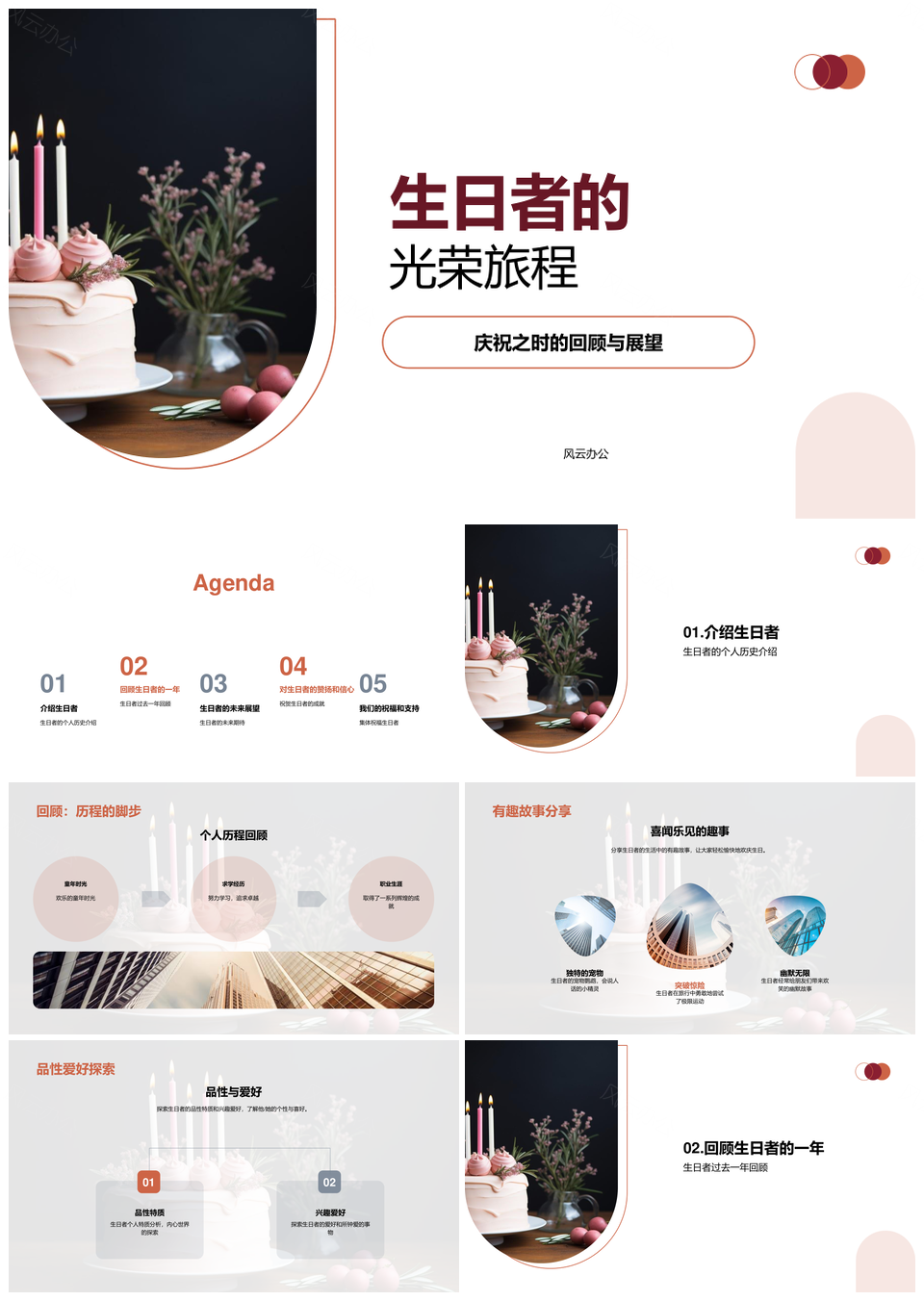 风云办公提供的生日者光辉旅程主持趣事回顾展望祝福PPT模板,下载格式为pptx,一共23页,作品中文字及图均可以修改和编辑,图片更改请在作品中右键图片并更换,文字修改请直接点击文字进行修改。