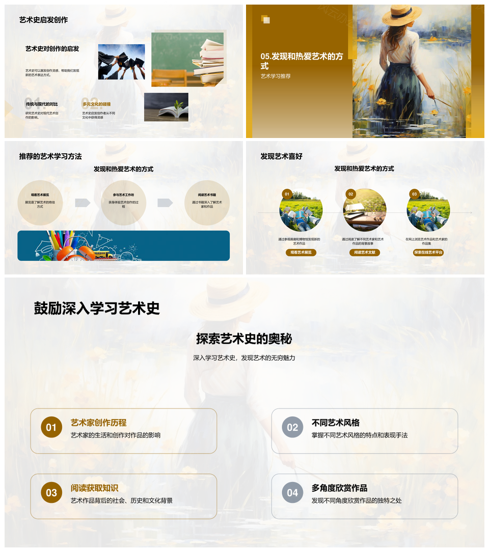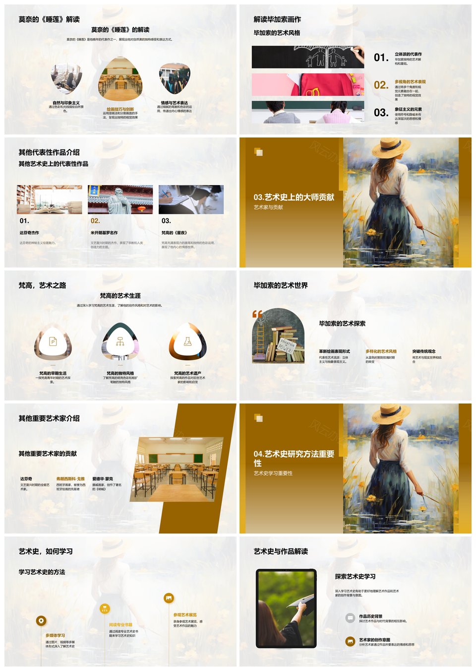 这是一张艺术史莫奈毕加索梵高睡莲艺术教育专家PPT模板,包含艺术史、莫奈、毕加索、梵高、睡莲、艺术教育、专家等主题内容,也可用作艺术史莫奈毕加索梵高、莫奈毕加索梵高睡莲、毕加索梵高睡莲艺术、梵高睡莲艺术教育、睡莲艺术教育专家、艺术教育专家莫奈、艺术史睡莲艺术教育、艺术史梵高睡莲艺术、莫奈睡莲艺术教育、毕加索梵高艺术教育、梵高艺术教育专家、艺术史艺术教育专家、莫奈毕加索艺术教育、毕加索梵高教育专家、睡莲艺术专家莫奈等PPT场景使用。 风云办公提供的艺术史莫奈毕加索梵高睡莲艺术教育专家PPT模板,下载格式为pptx,一共23页,作品中文字及图均可以修改和编辑,图片更改请在作品中右键图片并更换,文字修改请直接点击文字进行修改。