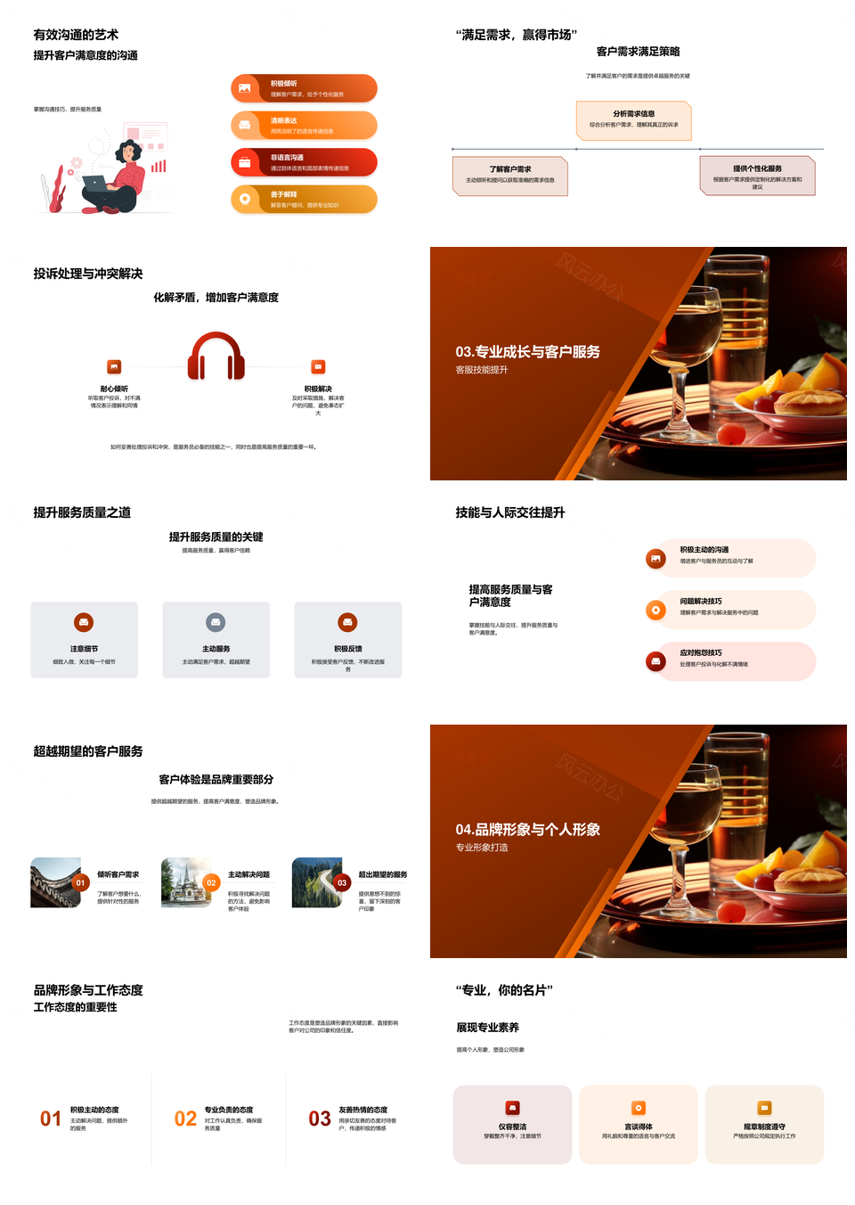 这是一张服务员职业礼仪沟通技巧培训提升服务质量PPT模板,包含服务员、职业、礼仪、沟通、技巧、培训、提升、服务、质量等主题内容,也可用作服务员职业礼仪沟通技巧培训、职业礼仪沟通技巧培训提升、沟通技巧培训提升服务质量、职业礼仪培训提升服务质量、服务员职业礼仪培训、职业礼仪沟通技巧、沟通技巧培训提升、培训提升服务质量、服务员沟通技巧培训、职业礼仪培训提升、沟通技巧培训、提升服务质量、服务员培训、职业礼仪培训、培训提升等PPT场景使用。 风云办公提供的服务员职业礼仪沟通技巧培训提升服务质量PPT模板,下载格式为pptx,一共23页,作品中文字及图均可以修改和编辑,图片更改请在作品中右键图片并更换,文字修改请直接点击文字进行修改。