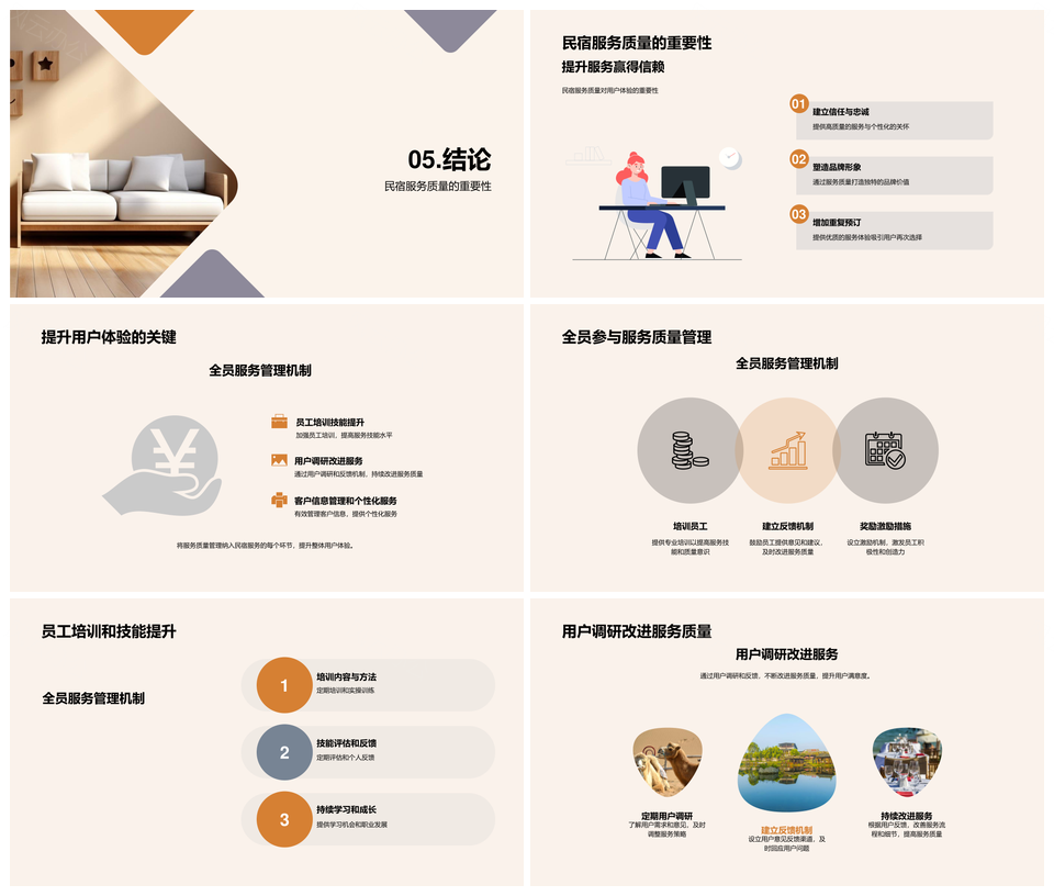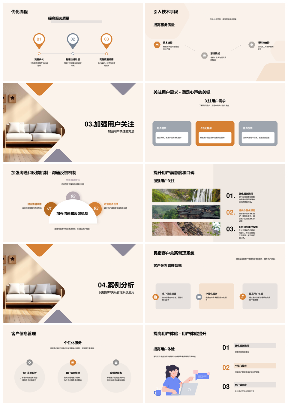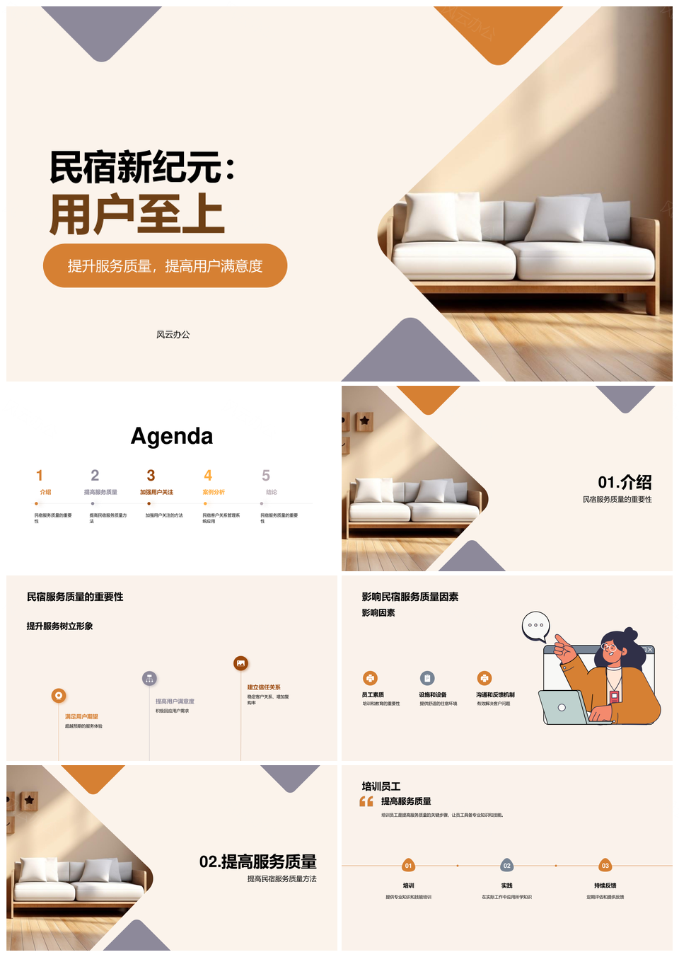 风云办公提供的民宿服务品质用户体验管理新纪元PPT模板,下载格式为pptx,一共24页,作品中文字及图均可以修改和编辑,图片更改请在作品中右键图片并更换,文字修改请直接点击文字进行修改。