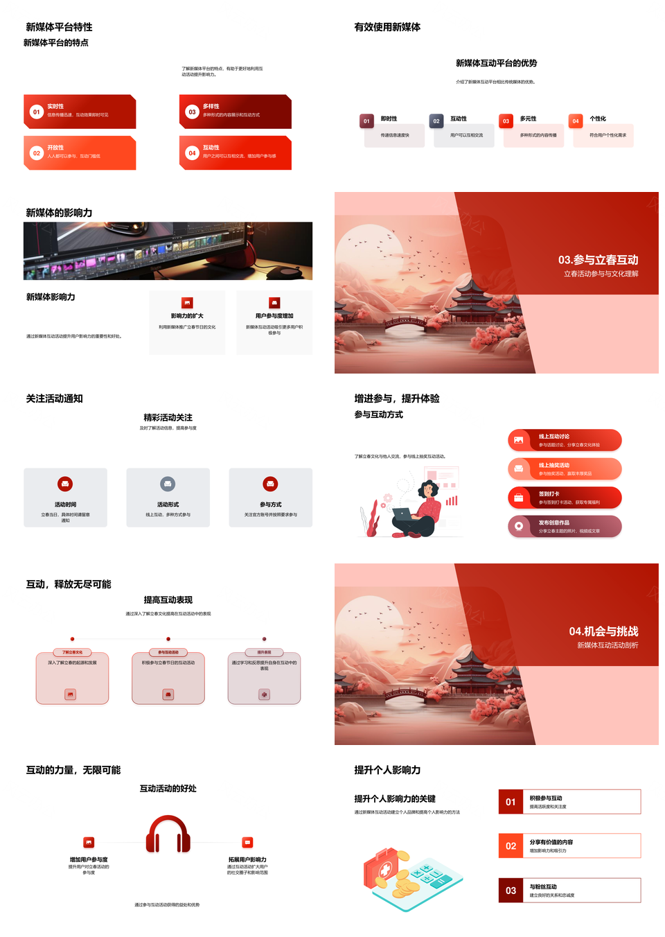 这是一张立春文化新媒体互动传承策略PPT模板,包含立春、文化、新媒体、互动、传承、策略等主题内容,也可用作立春文化新媒体互动、文化新媒体互动传承、新媒体互动传承策略、立春文化新媒体、文化新媒体互动、新媒体互动传承、互动传承策略、立春文化、文化新媒体、新媒体互动、互动传承、传承策略、立春文化互动传承、新媒体互动策略、文化互动传承策略等PPT场景使用。