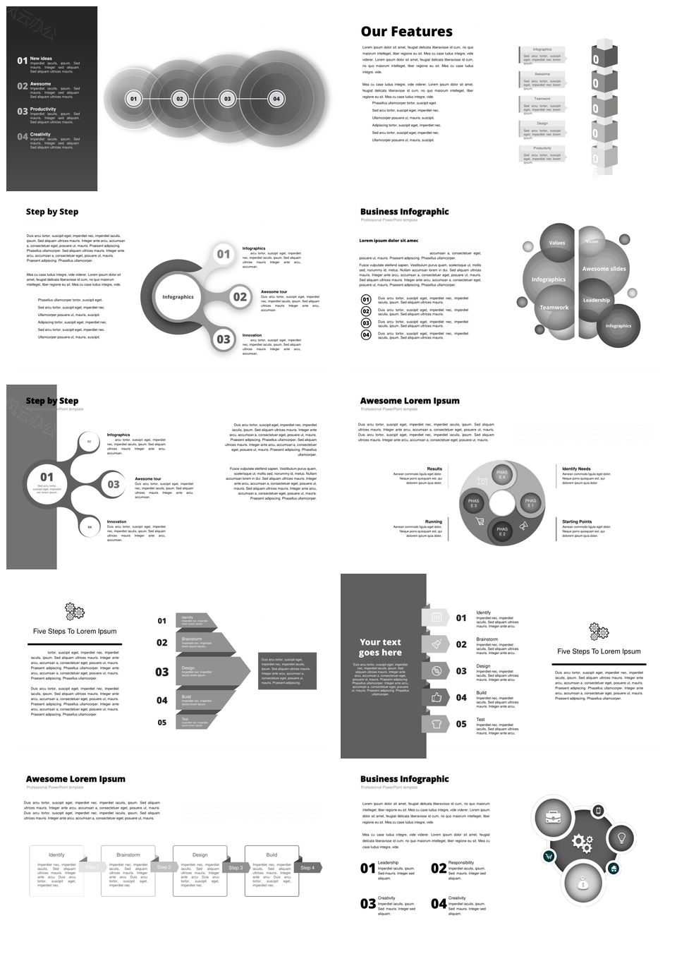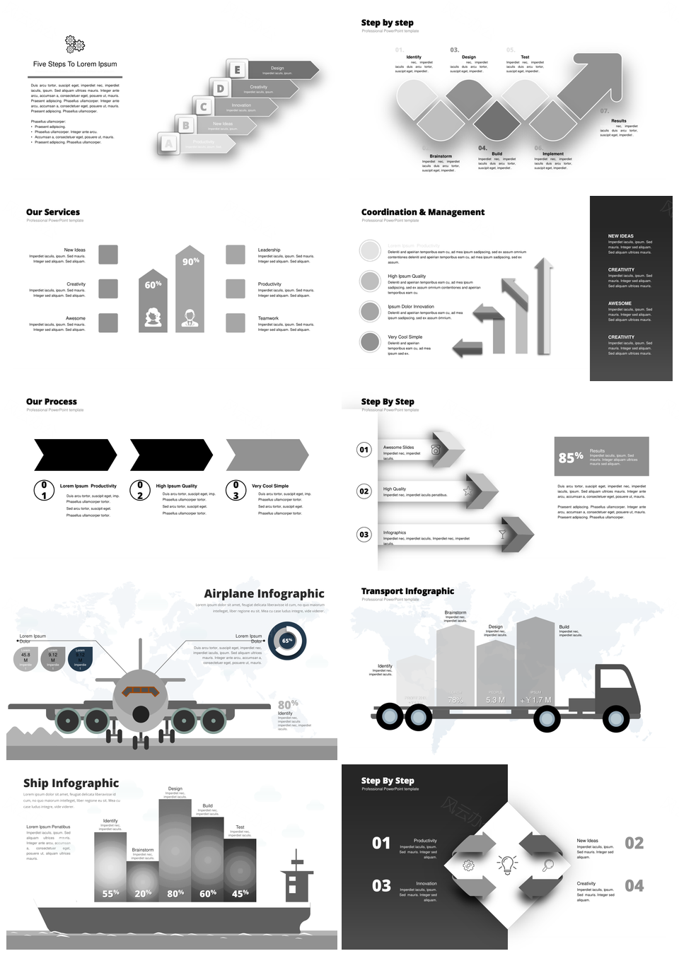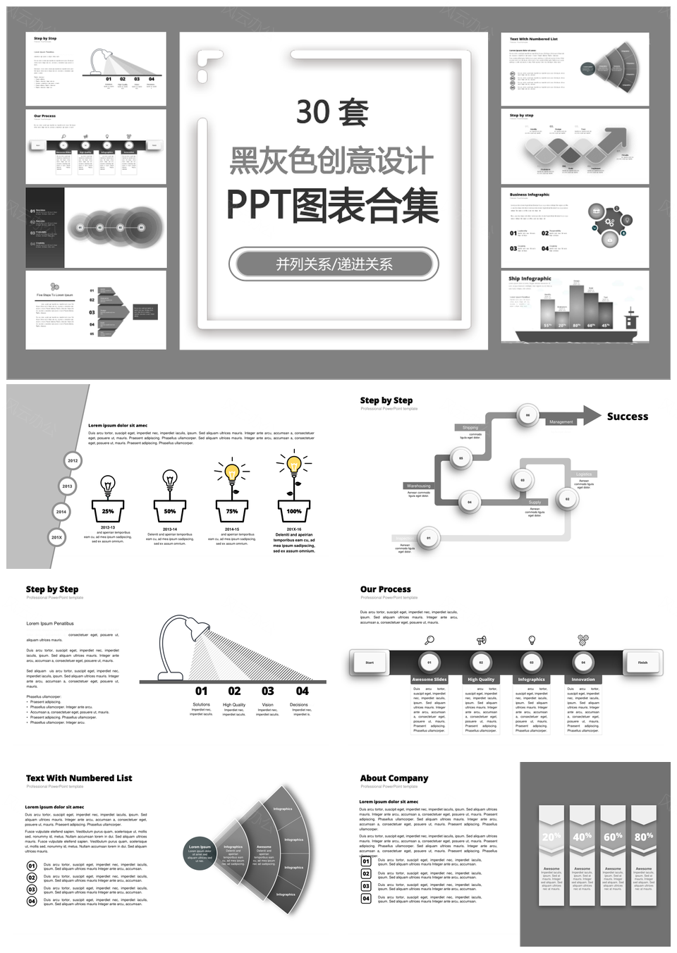 这是一张黑灰色创意设计并列关系递进关系PPT图表合集,包含黑灰色、创意设计、并列关系、递进关系、图表合集等主题内容,也可用作黑灰色、创意设计、并列关系、递进关系、PPT图表、合集