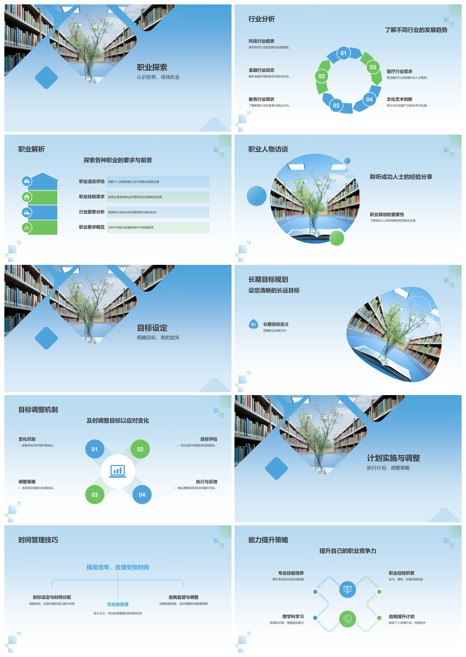 风云办公提供的大学生职业规划重复多样图书馆书架PPT模板,下载格式为pptx,一共20页,作品中文字及图均可以修改和编辑,图片更改请在作品中右键图片并更换,文字修改请直接点击文字进行修改。