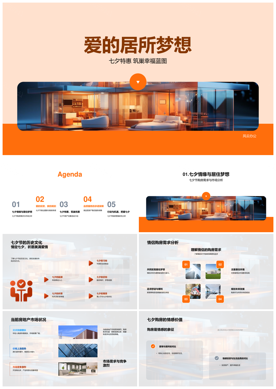 风云办公提供的七夕情侣购房特惠筑巢理想住宅PPT模板,下载格式为pptx,一共28页,作品中文字及图均可以修改和编辑,图片更改请在作品中右键图片并更换,文字修改请直接点击文字进行修改。