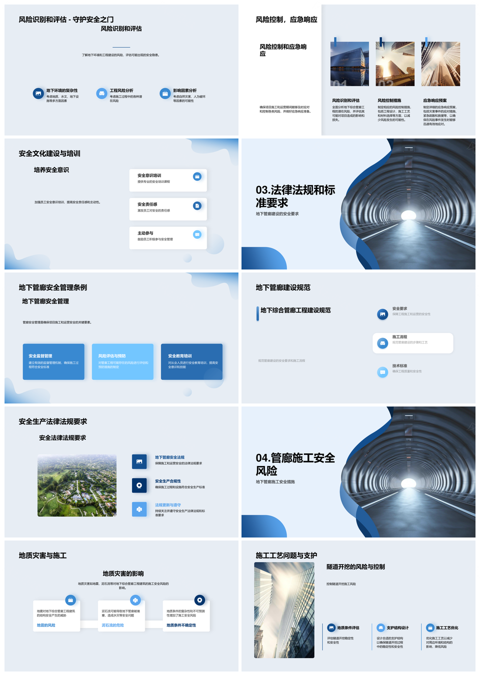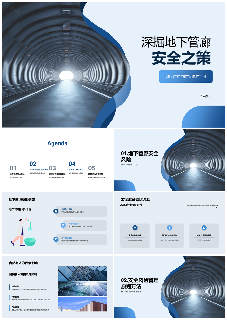 风云办公提供的地下隧道施工运营安全风险管理PPT模板,下载格式为pptx,一共23页,作品中文字及图均可以修改和编辑,图片更改请在作品中右键图片并更换,文字修改请直接点击文字进行修改。