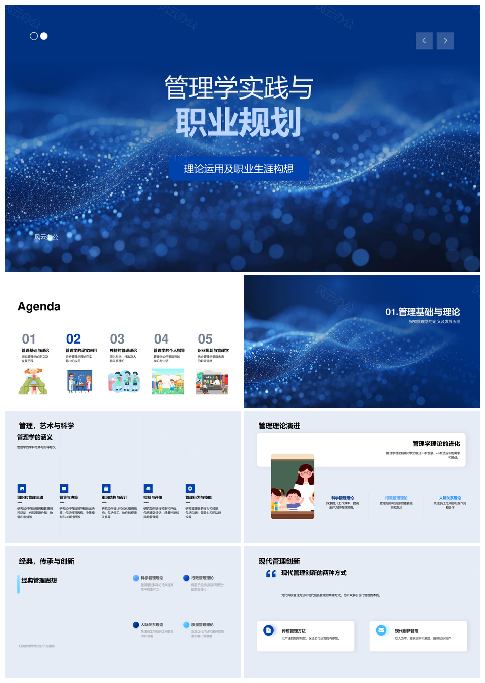 风云办公提供的管理学理论发展实践与职业规划PPT模板,下载格式为pptx,一共33页,作品中文字及图均可以修改和编辑,图片更改请在作品中右键图片并更换,文字修改请直接点击文字进行修改。