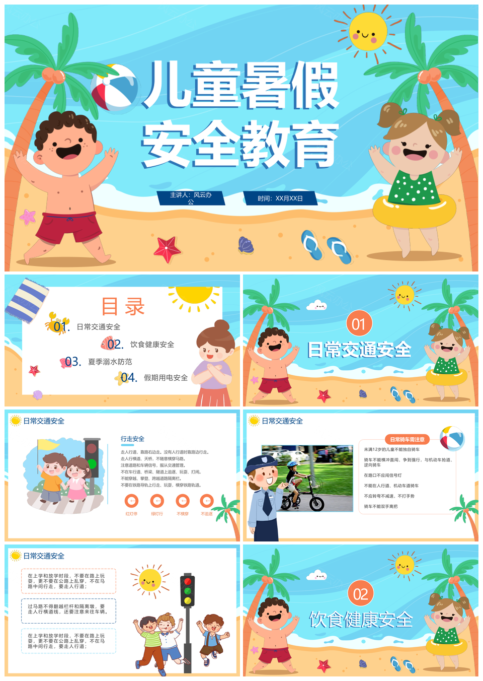 风云办公提供的清新卡通儿童暑假安全教育PPT模板,下载格式为pptx,一共19页,作品中文字及图均可以修改和编辑,图片更改请在作品中右键图片并更换,文字修改请直接点击文字进行修改。