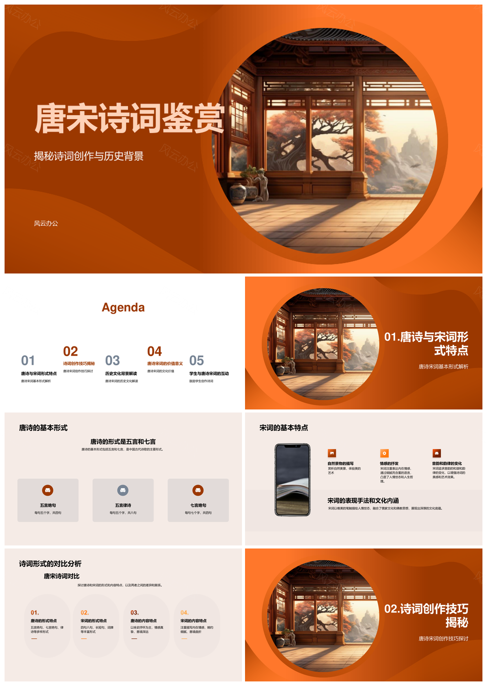 风云办公提供的唐宋诗词创作技巧史境平仄韵素养析PPT模板,下载格式为pptx,一共23页,作品中文字及图均可以修改和编辑,图片更改请在作品中右键图片并更换,文字修改请直接点击文字进行修改。
