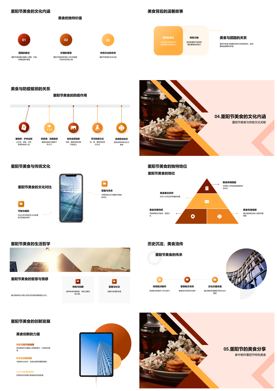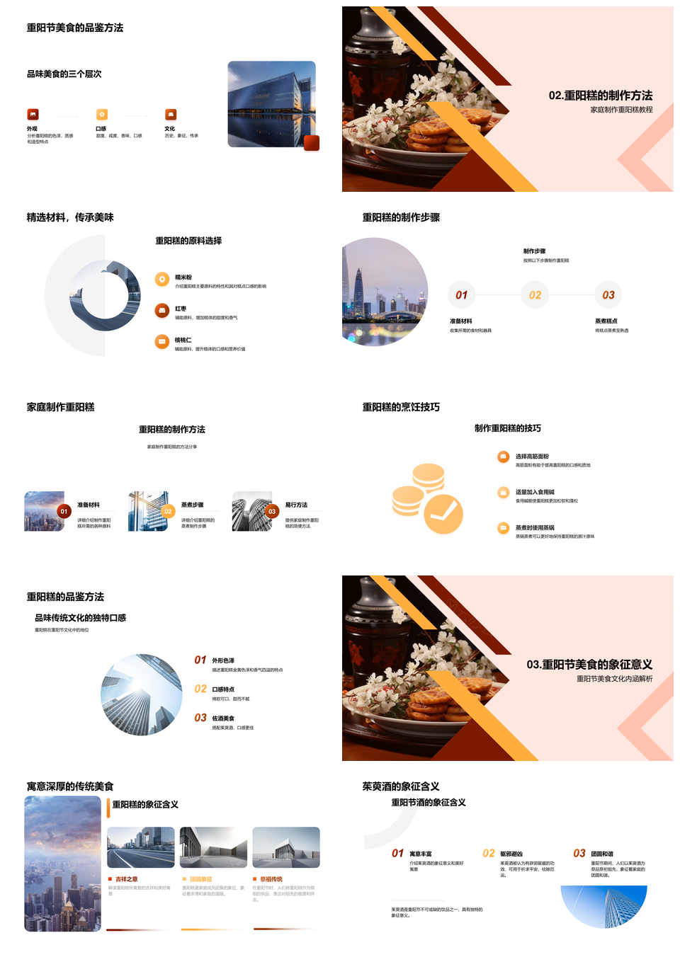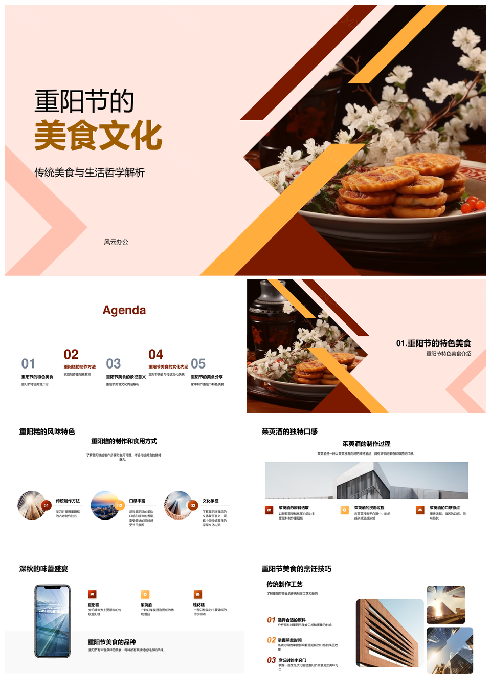 风云办公提供的重阳节传统美食重阳糕茱萸酒象征团圆PPT模板,下载格式为pptx,一共33页,作品中文字及图均可以修改和编辑,图片更改请在作品中右键图片并更换,文字修改请直接点击文字进行修改。