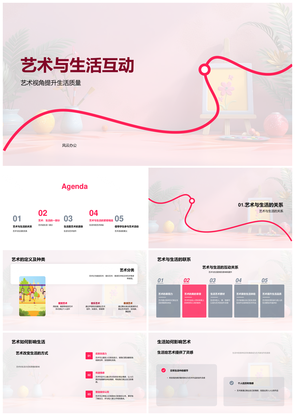 风云办公提供的艺术教育提升生活与创作互动视角PPT模板,下载格式为pptx,一共28页,作品中文字及图均可以修改和编辑,图片更改请在作品中右键图片并更换,文字修改请直接点击文字进行修改。