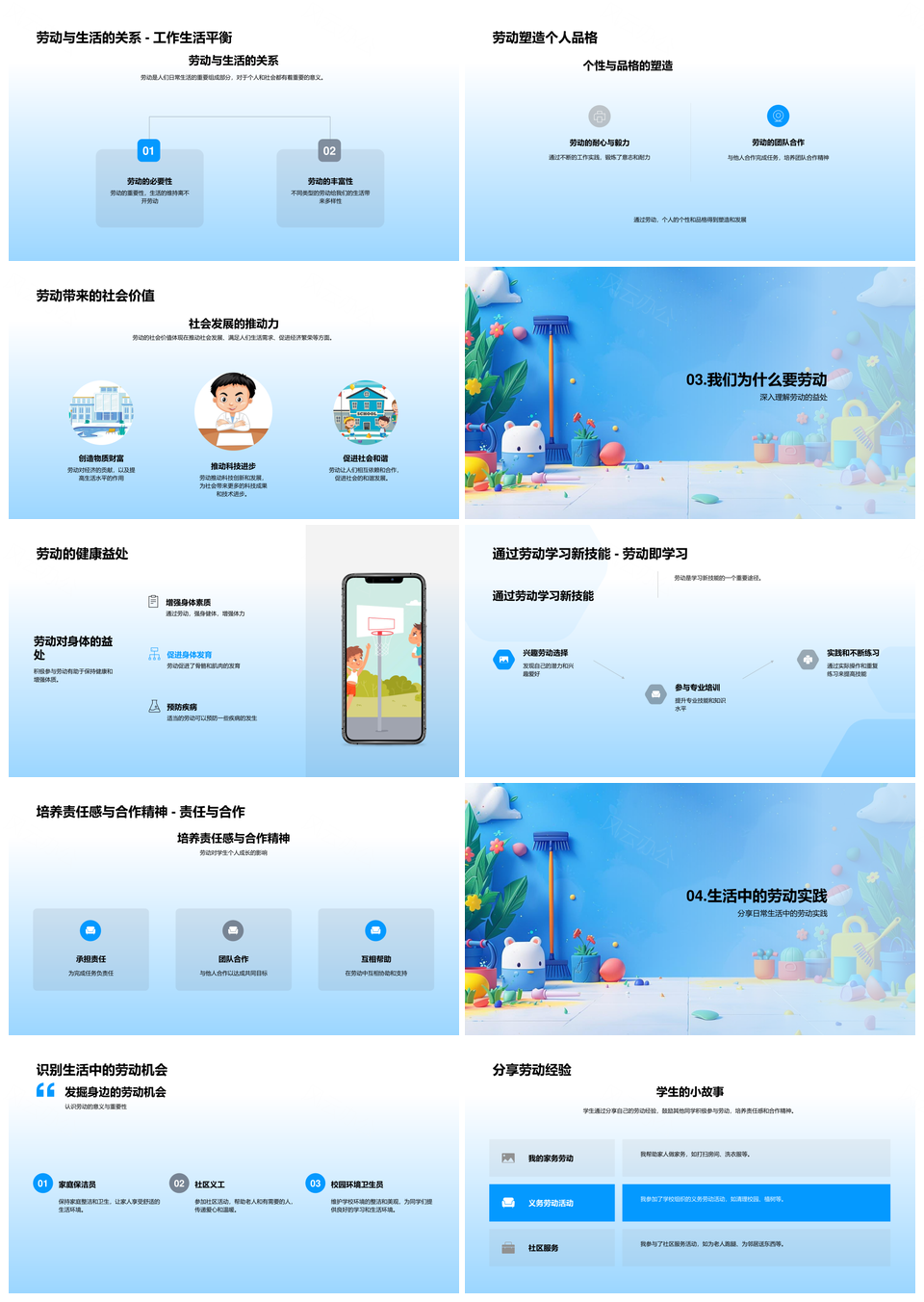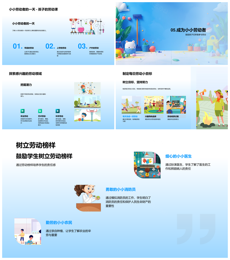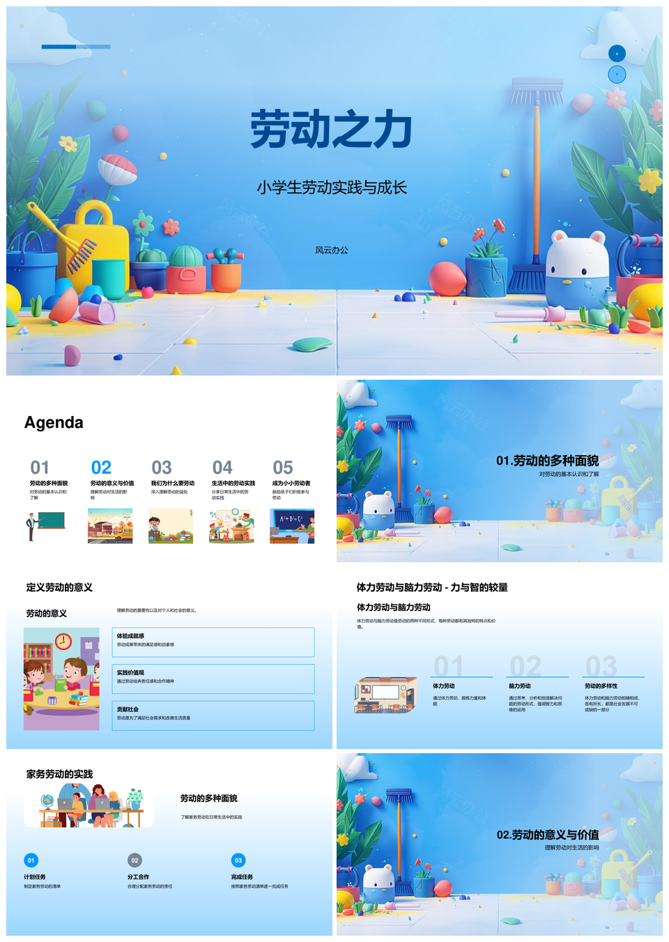 风云办公提供的小学生劳动成长育品格多元实践PPT模板,下载格式为pptx,一共23页,作品中文字及图均可以修改和编辑,图片更改请在作品中右键图片并更换,文字修改请直接点击文字进行修改。