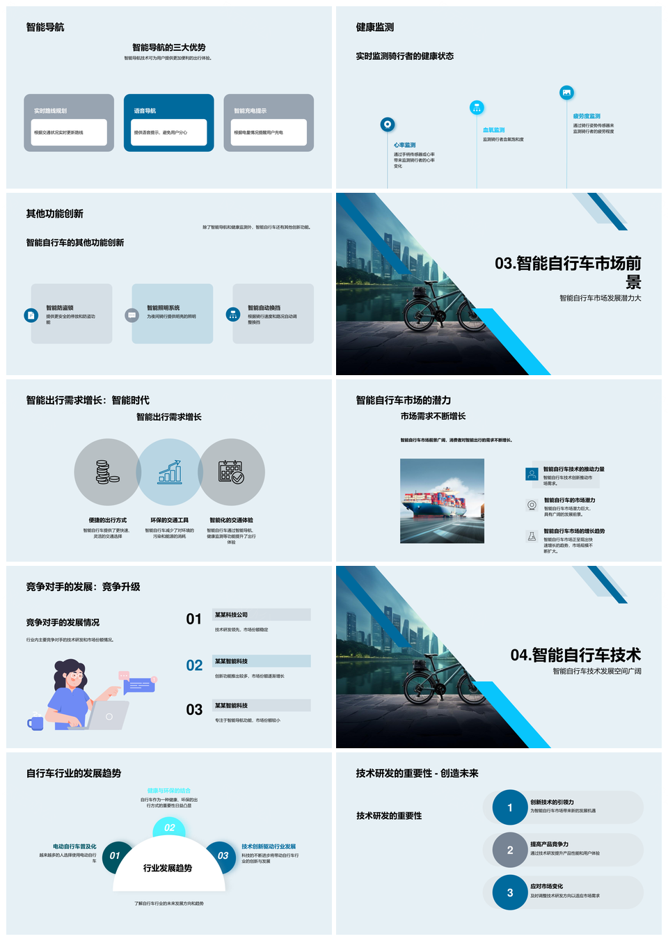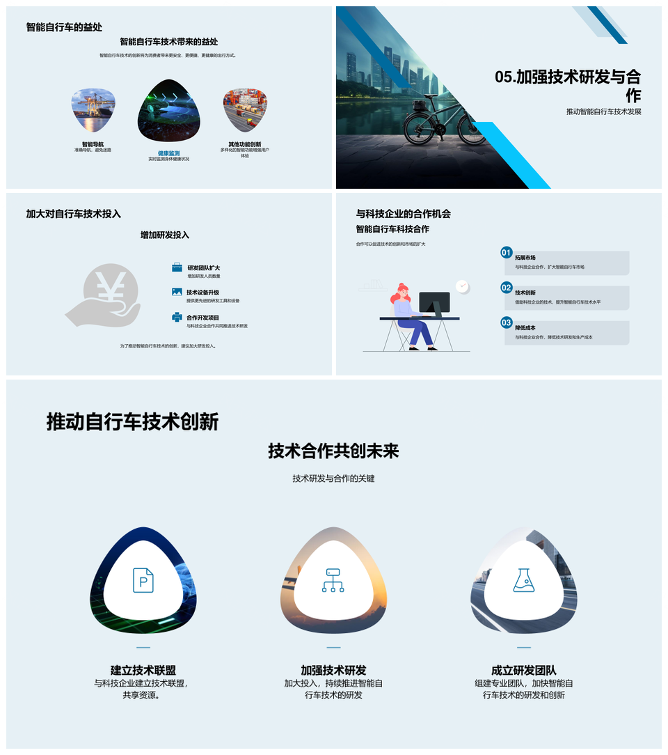 这是一张智能自行车技术创新研发工程师制造商未来出行PPT模板,包含智能自行车、技术创新、研发工程师、制造商、未来出行等主题内容,也可用作智能自行车技术创新研发、智能自行车技术研发工程师、技术创新研发工程师制造商、研发工程师制造商未来出行、智能自行车技术创新、智能自行车研发工程师、技术创新研发工程师、创新研发工程师制造商、研发工程师制造商、工程师制造商未来出行、智能自行车技术、技术创新、创新研发、研发工程师、工程师制造商等PPT场景使用。 风云办公提供的智能自行车技术创新研发工程师制造商未来出行PPT模板,下载格式为pptx,一共23页,作品中文字及图均可以修改和编辑,图片更改请在作品中右键图片并更换,文字修改请直接点击文字进行修改。