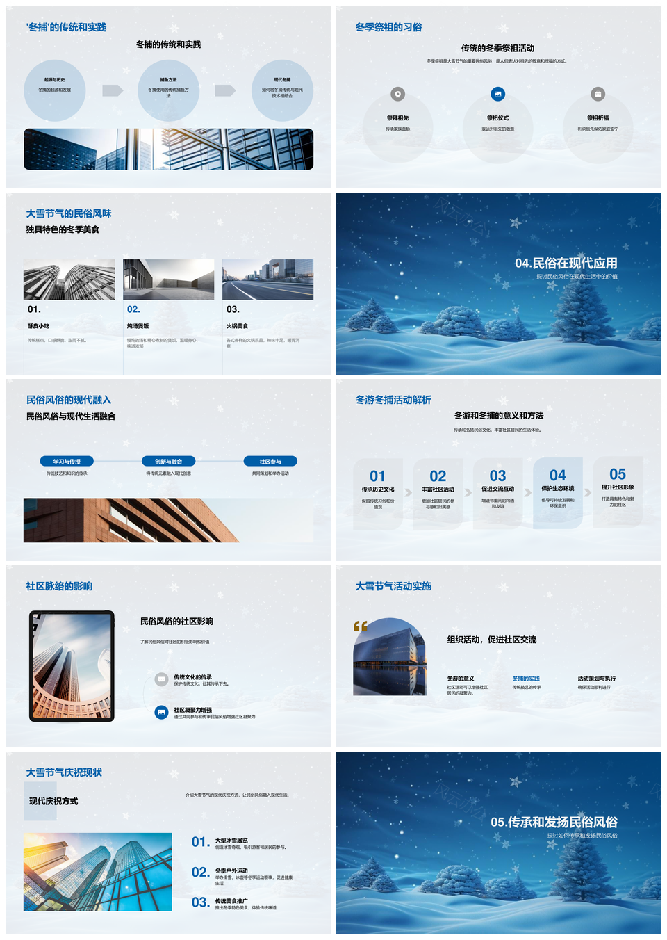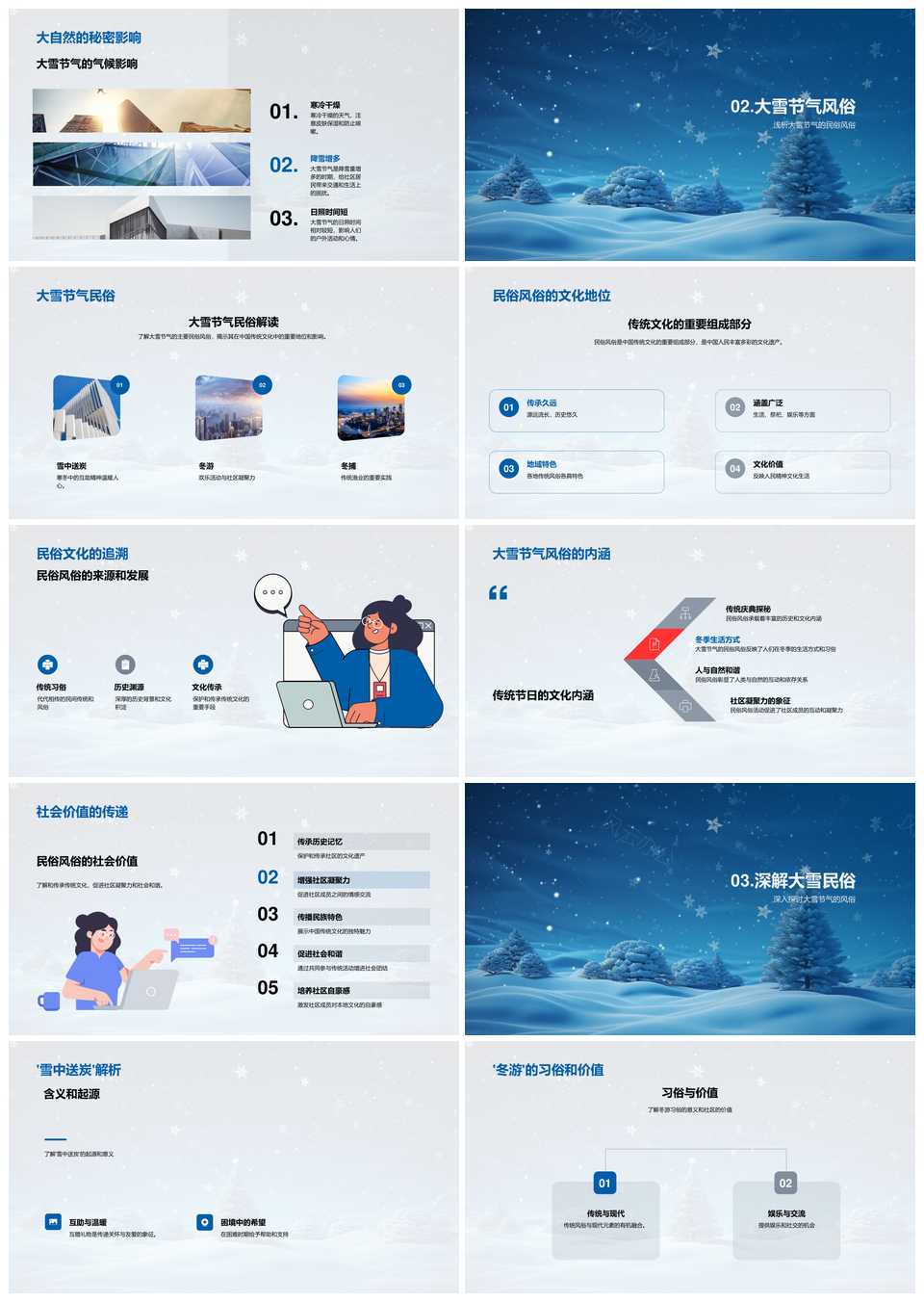 风云办公提供的大雪民俗古今融冬趣雪暖社区情PPT模板,下载格式为pptx,一共33页,作品中文字及图均可以修改和编辑,图片更改请在作品中右键图片并更换,文字修改请直接点击文字进行修改。