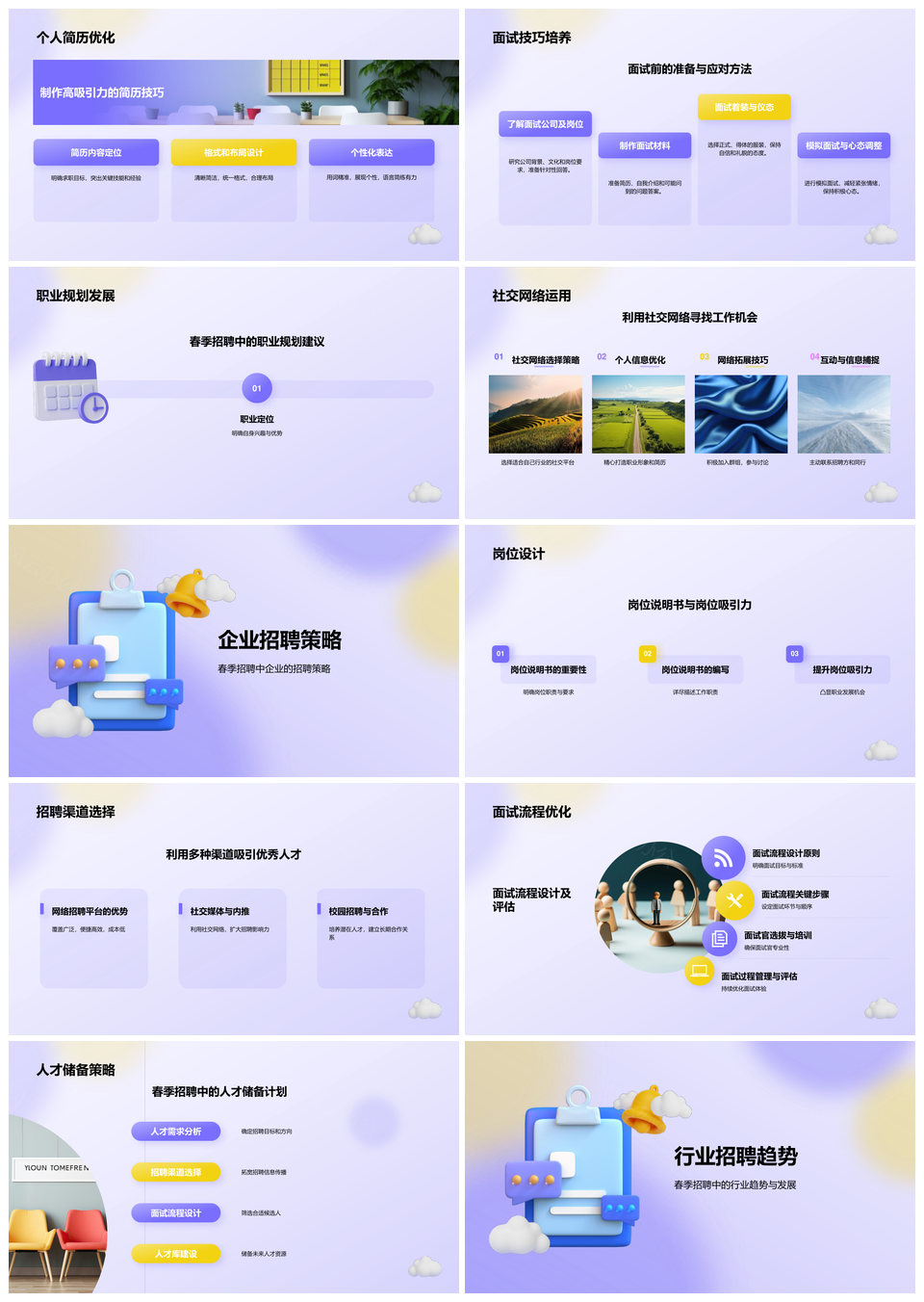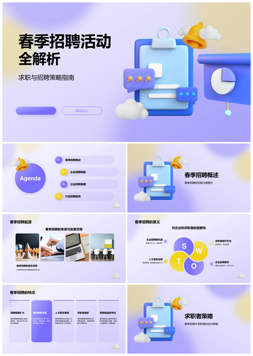 这款职场风PPT模板以白色为基底,搭配浅紫、灰紫的渐变层次,融合霓虹紫的现代感点缀,传递专业与艺术的平衡感。清爽的浅蓝至藏蓝配色方案,叠加橘黄与土黄提亮,兼顾沉稳与活力。插画风手绘元素贯穿全稿,搭配矢量图表、商务插图,精准适配方案汇报、数据解析等场景。版面布局注重呼吸感与逻辑性,模块化设计支持灵活调整,素材库涵盖图标、图形、色块组合,帮助用户高效呈现复杂信息,满足创意提案、行业分析等多元需求,兼具专业表达与视觉吸引力。