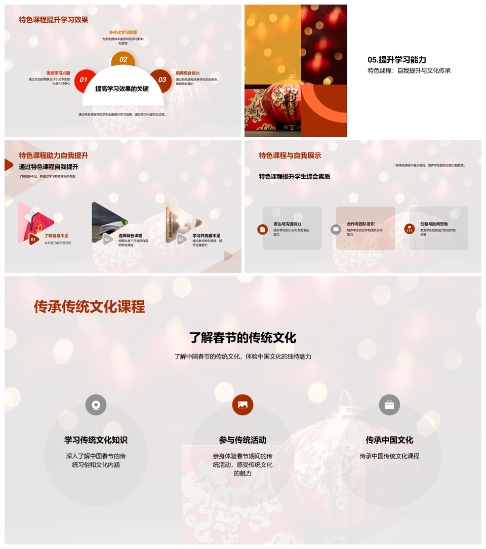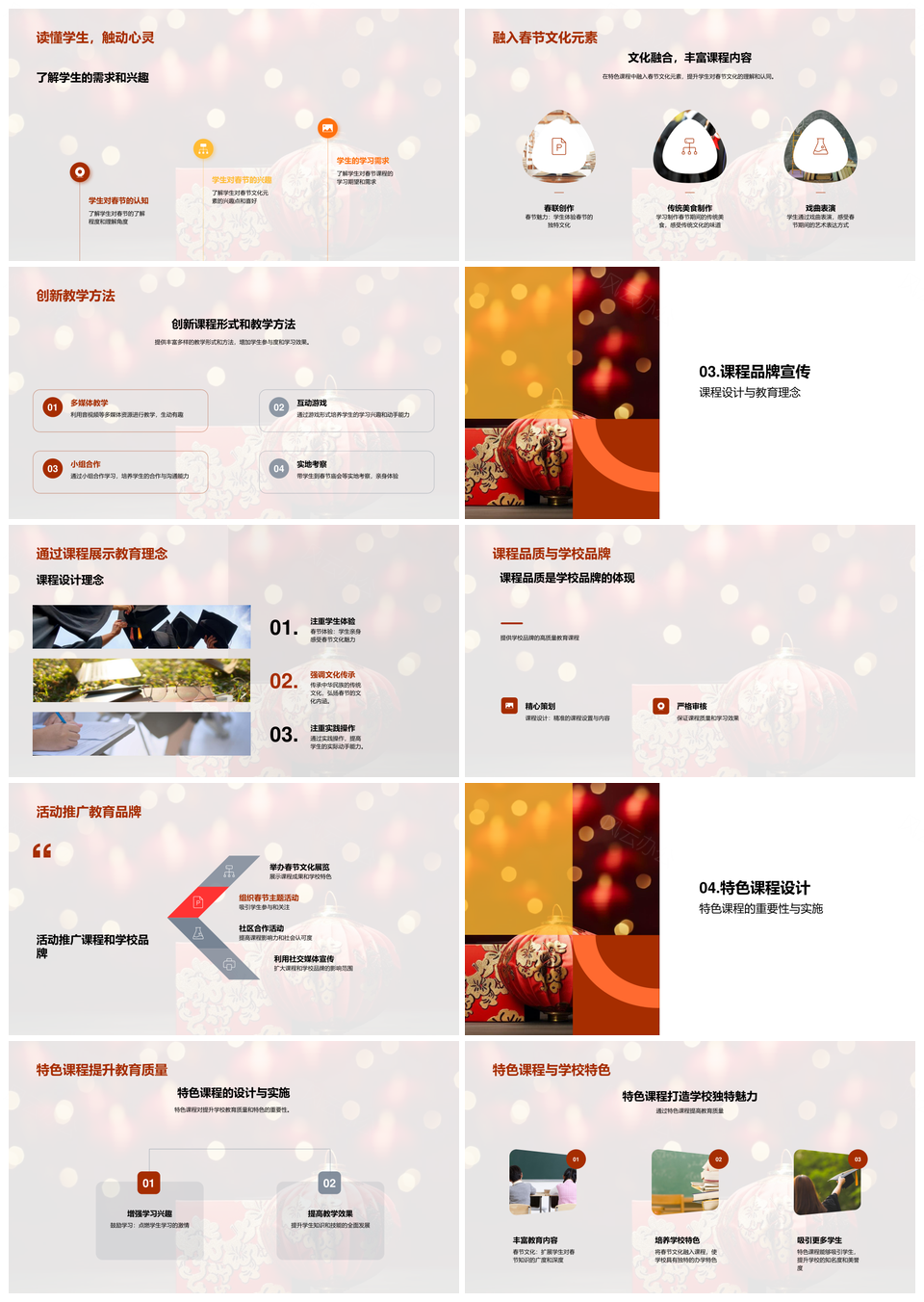 风云办公提供的春节特色课程创新提升教育文化质量PPT模板,下载格式为pptx,一共23页,作品中文字及图均可以修改和编辑,图片更改请在作品中右键图片并更换,文字修改请直接点击文字进行修改。