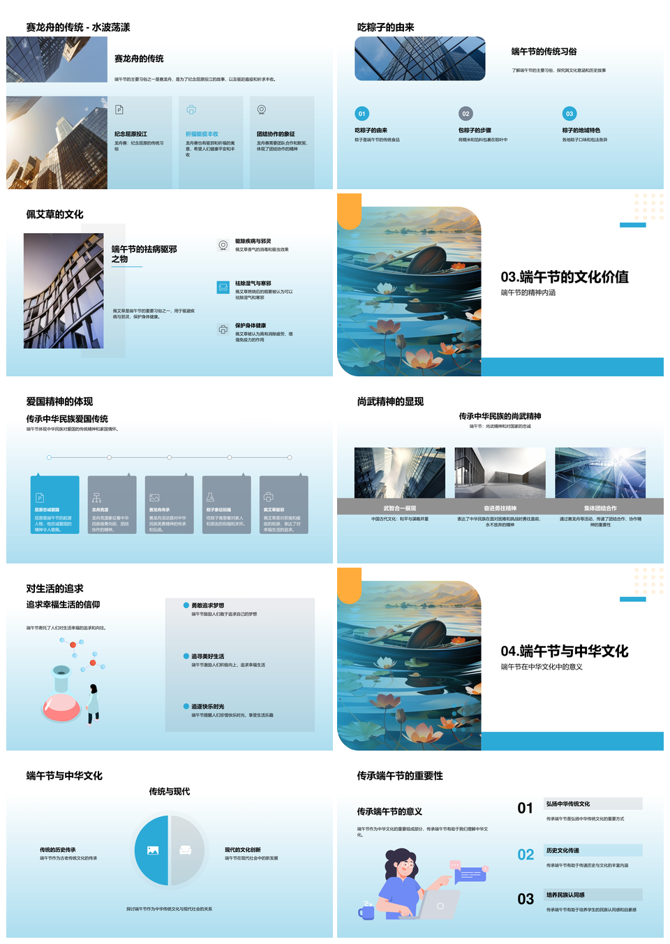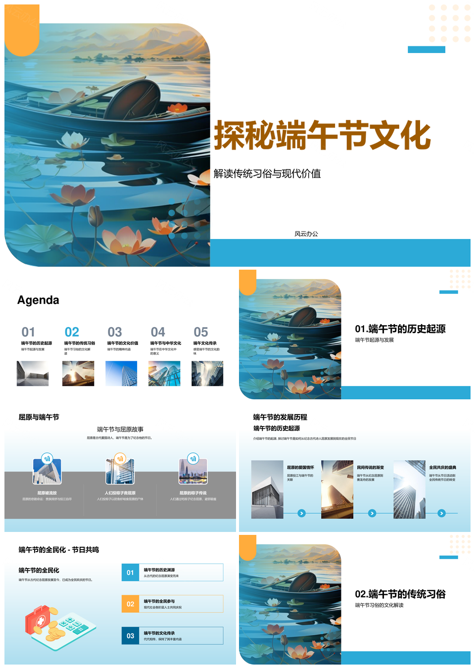 风云办公提供的端午屈原爱国精神龙舟粽艾习俗文化PPT模板,下载格式为pptx,一共23页,作品中文字及图均可以修改和编辑,图片更改请在作品中右键图片并更换,文字修改请直接点击文字进行修改。