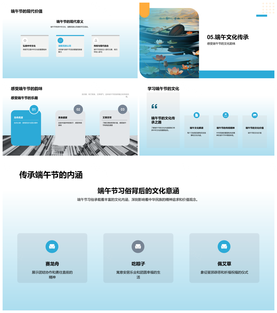 这是一张端午屈原爱国精神龙舟粽艾习俗文化PPT模板,包含端午、屈原、爱国精神、龙舟、粽、艾、习俗、文化等主题内容,也可用作端午屈原爱国精神龙舟、端午龙舟习俗文化屈原、屈原爱国精神端午龙舟、端午爱国精神习俗文化、龙舟习俗文化端午屈原、端午屈原龙舟习俗文化、屈原龙舟端午爱国精神、爱国精神端午龙舟习俗、端午习俗文化屈原爱国、屈原端午龙舟习俗文化、龙舟端午习俗爱国文化、端午文化爱国精神习俗、屈原爱国端午龙舟文化、习俗文化端午屈原龙舟、端午龙舟屈原爱国文化等PPT场景使用。