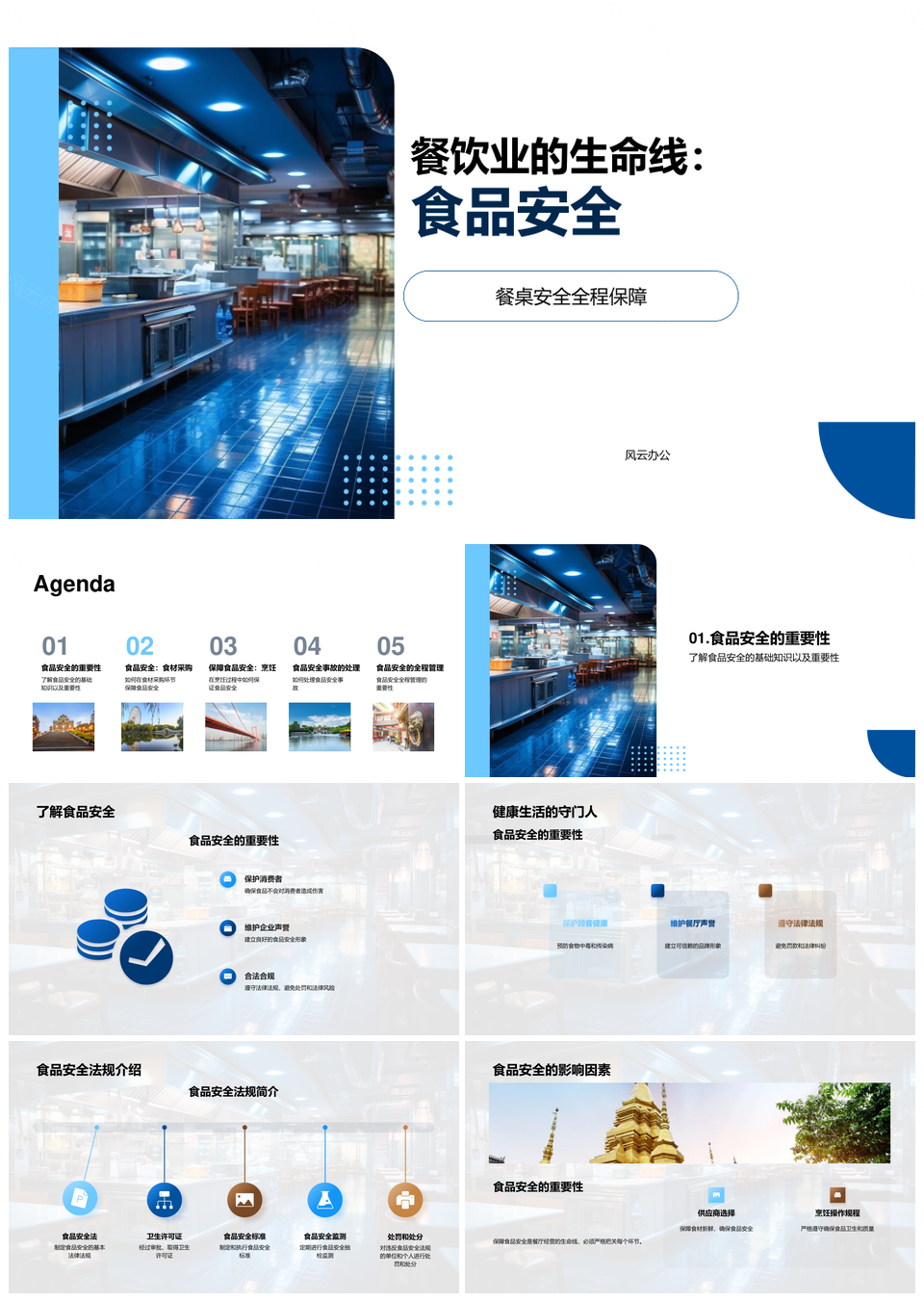 风云办公提供的餐饮厨房食安全流程动画管控指南PPT模板,下载格式为pptx,一共33页,作品中文字及图均可以修改和编辑,图片更改请在作品中右键图片并更换,文字修改请直接点击文字进行修改。