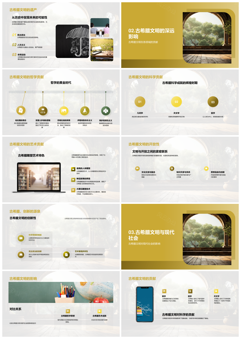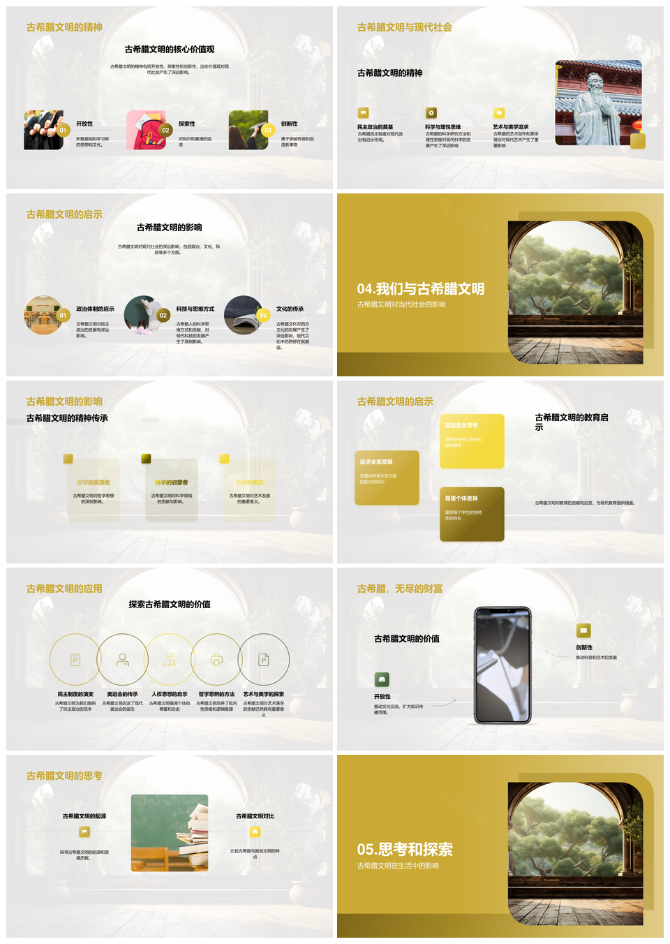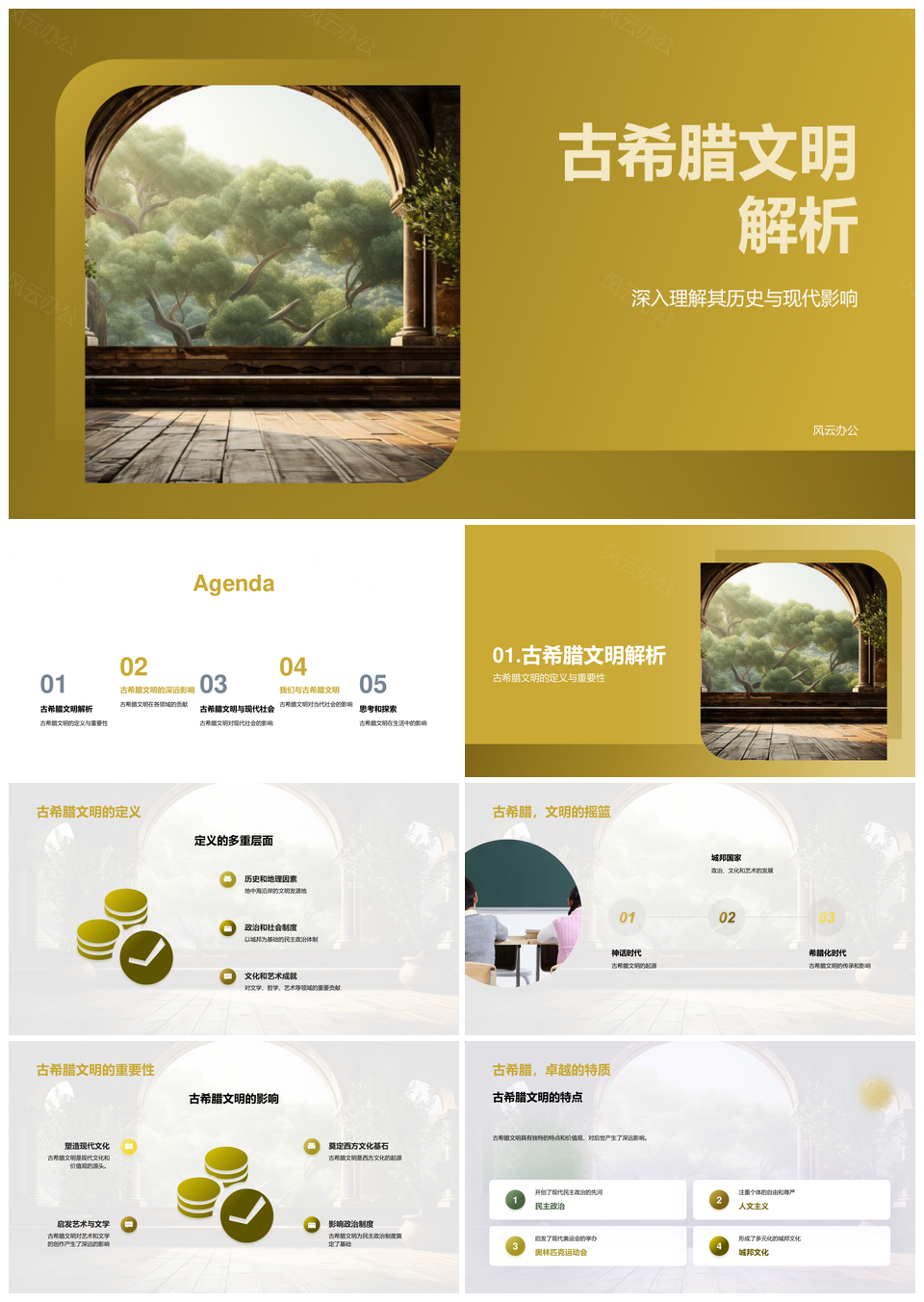 风云办公提供的古希腊哲学科学艺术柱式创新影响PPT模板,下载格式为pptx,一共33页,作品中文字及图均可以修改和编辑,图片更改请在作品中右键图片并更换,文字修改请直接点击文字进行修改。