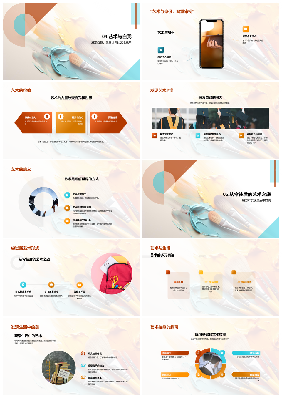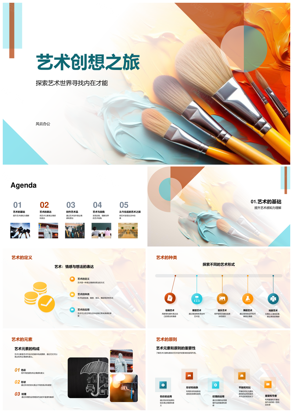 风云办公提供的艺术基础元素与自我表达创想之旅PPT模板,下载格式为pptx,一共28页,作品中文字及图均可以修改和编辑,图片更改请在作品中右键图片并更换,文字修改请直接点击文字进行修改。