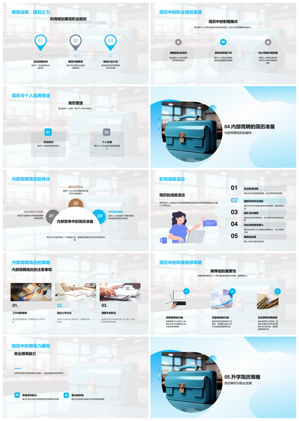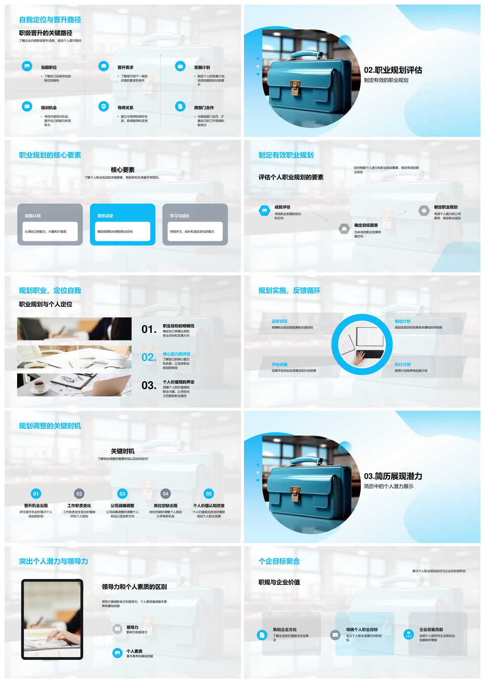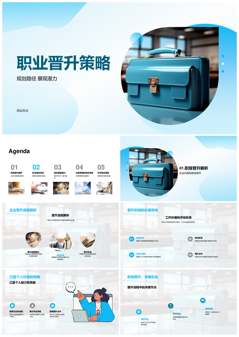风云办公提供的职业晋升策略企业职级竞聘简历规划PPT模板,下载格式为pptx,一共33页,作品中文字及图均可以修改和编辑,图片更改请在作品中右键图片并更换,文字修改请直接点击文字进行修改。