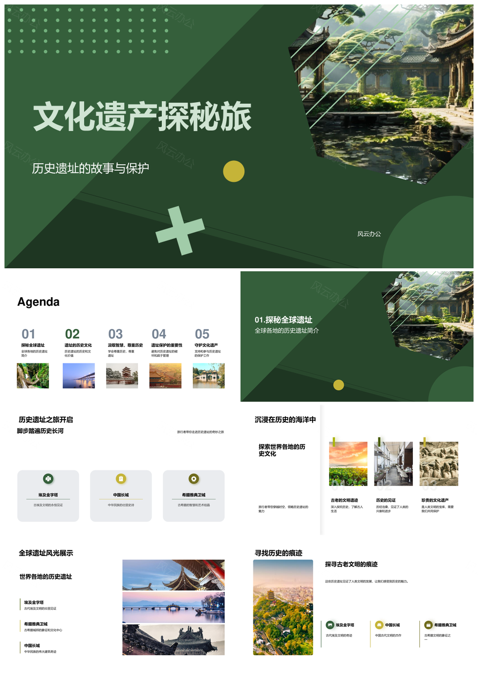 风云办公提供的全球旅者探秘古遗址守护文化遗产PPT模板,下载格式为pptx,一共33页,作品中文字及图均可以修改和编辑,图片更改请在作品中右键图片并更换,文字修改请直接点击文字进行修改。
