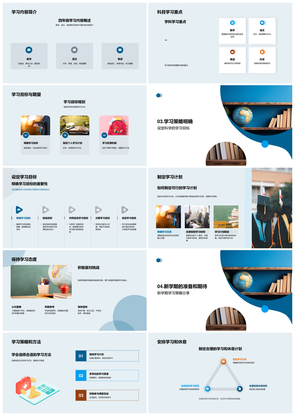 这是一张四年级学习新征程规划目标策略总结PPT模板,包含四年级、学习、新征程、规划、目标、策略、总结等主题内容,也可用作四年级学习新征程规划、学习新征程规划目标、新征程规划目标策略、四年级学习规划目标、学习规划目标策略、四年级新征程规划策略、规划目标策略总结、四年级学习新征程、学习新征程规划、新征程规划目标、规划目标策略、目标策略总结、四年级学习规划、学习目标策略、新征程策略总结等PPT场景使用。