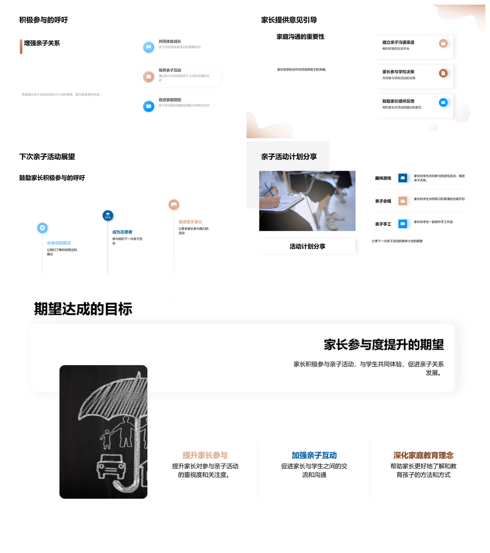 这是一张家长学生互动提升亲子活动主题参与度反馈PPT模板,包含家长、学生、互动、提升、亲子活动、主题、参与度、反馈等主题内容,也可用作家长学生互动提升亲子活动、互动提升亲子活动参与度、提升亲子活动主题参与度、亲子活动主题参与度反馈、家长学生亲子活动主题、家长互动提升参与度、学生互动亲子活动主题、互动亲子活动参与反馈、主题参与度反馈、家长学生互动亲子活动、亲子活动参与度反馈、提升主题参与度反馈、家长学生亲子活动、互动提升参与度、亲子活动参与反馈等PPT场景使用。 风云办公提供的家长学生互动提升亲子活动主题参与度反馈PPT模板,下载格式为pptx,一共33页,作品中文字及图均可以修改和编辑,图片更改请在作品中右键图片并更换,文字修改请直接点击文字进行修改。