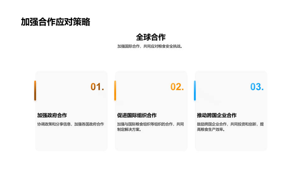 这是一张全球粮食安全挑战困境与政府合作应对PPT模板,包含全球、粮食安全、挑战、困境、政府、合作、应对等主题内容,也可用作全球粮食安全挑战困境、政府合作应对挑战、全球粮食安全政府合作、粮食安全挑战困境应对、全球政府合作应对、粮食安全挑战困境、政府应对挑战困境、全球粮食安全挑战、政府合作应对、全球粮食安全、粮食安全挑战、应对挑战困境、应对挑战、挑战困境、政府合作等PPT场景使用。