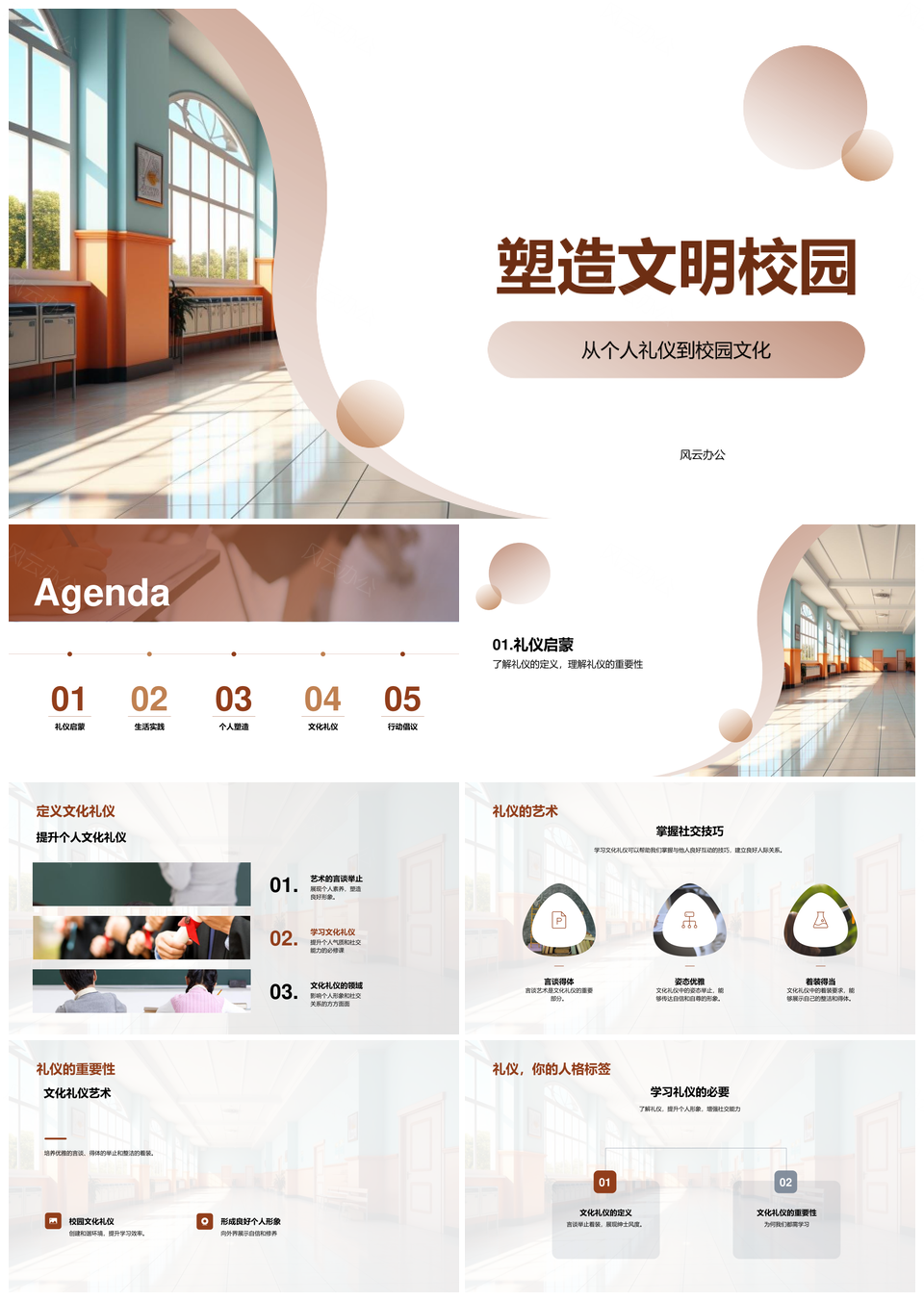风云办公提供的文明校园礼仪文化共建共筑PPT模板,下载格式为pptx,一共33页,作品中文字及图均可以修改和编辑,图片更改请在作品中右键图片并更换,文字修改请直接点击文字进行修改。