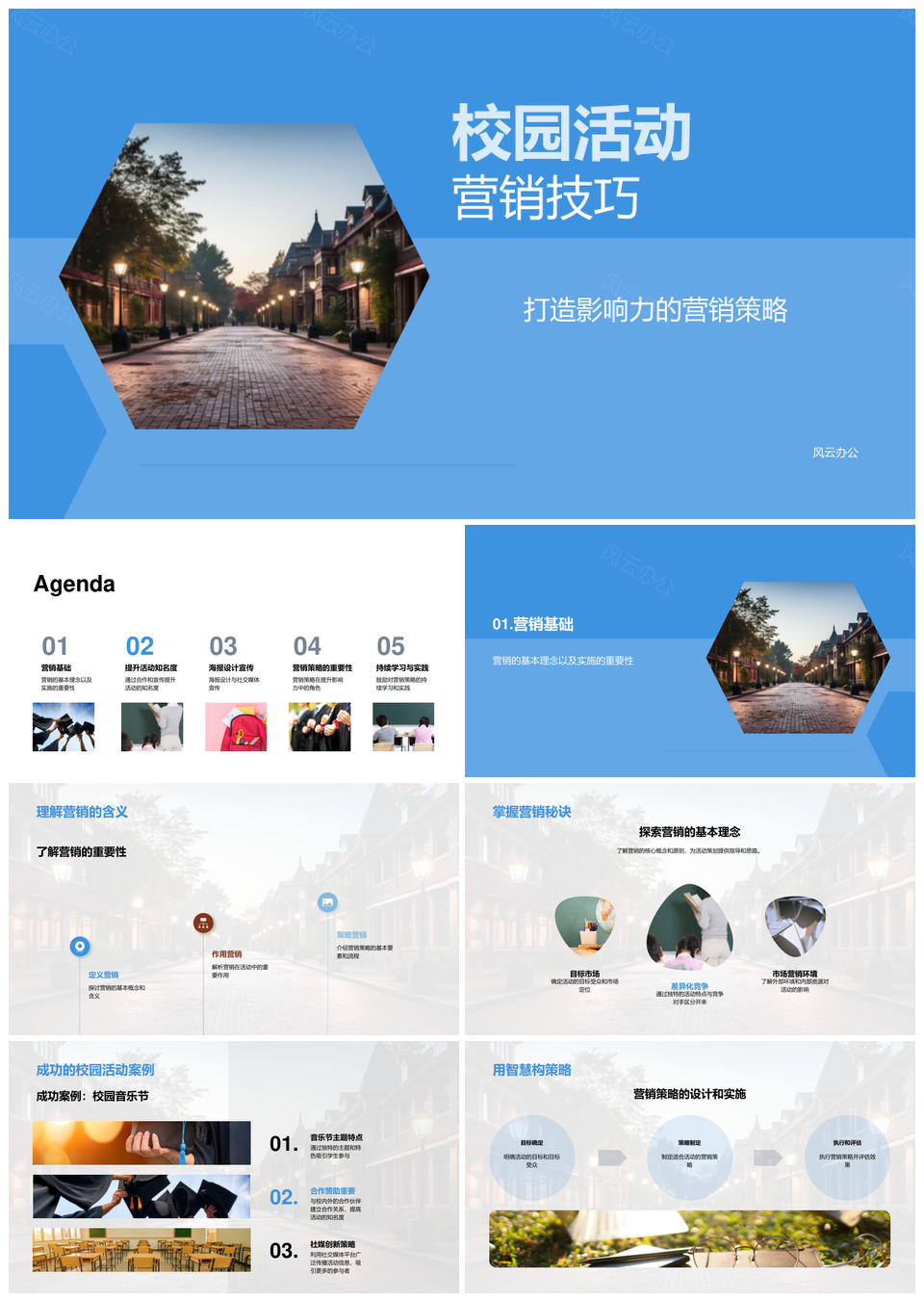 风云办公提供的校园活动营销策略设计与宣传推广PPT模板,下载格式为pptx,一共28页,作品中文字及图均可以修改和编辑,图片更改请在作品中右键图片并更换,文字修改请直接点击文字进行修改。