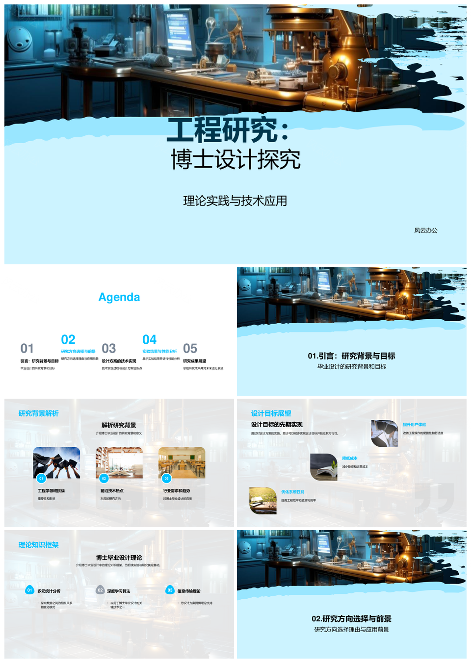 风云办公提供的博士工程设计理论实践与技术应用研究PPT模板,下载格式为pptx,一共23页,作品中文字及图均可以修改和编辑,图片更改请在作品中右键图片并更换,文字修改请直接点击文字进行修改。