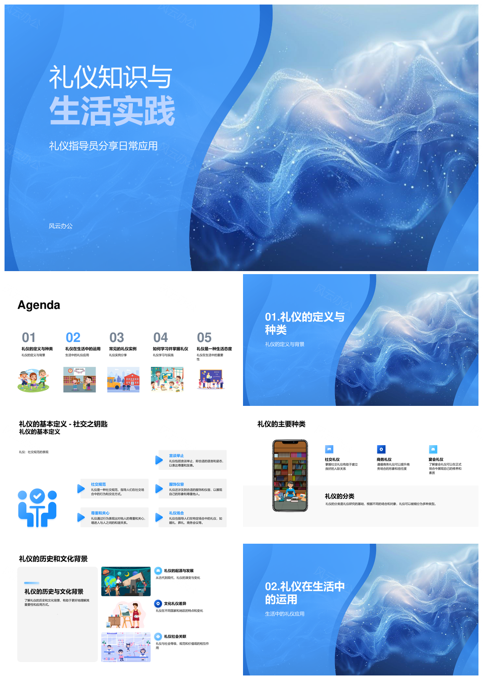 风云办公提供的礼仪知识学习生活实践应用PPT模板,下载格式为pptx,一共23页,作品中文字及图均可以修改和编辑,图片更改请在作品中右键图片并更换,文字修改请直接点击文字进行修改。