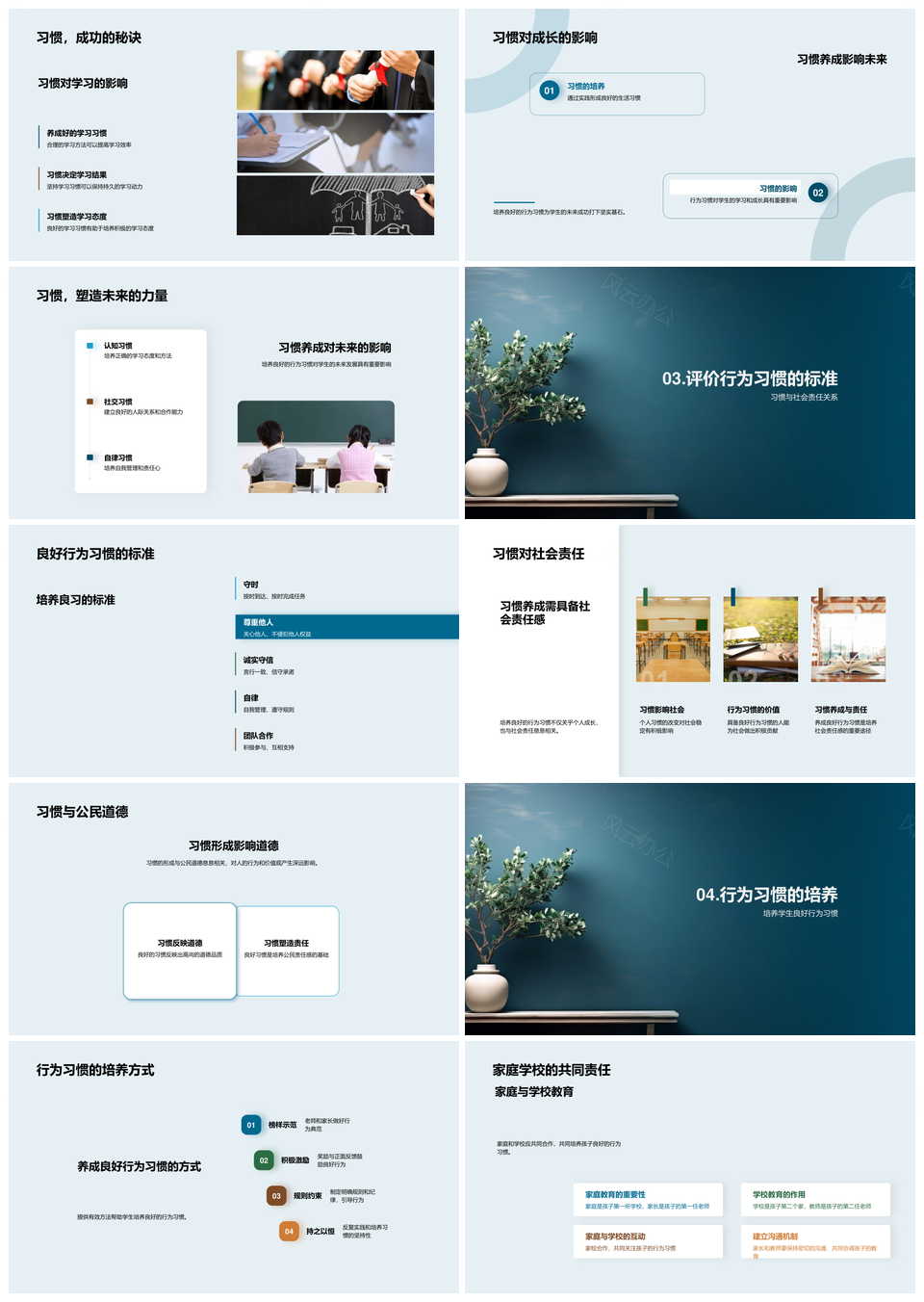 风云办公提供的青少年良好行为习惯与社会责任感培养PPT模板,下载格式为pptx,一共23页,作品中文字及图均可以修改和编辑,图片更改请在作品中右键图片并更换,文字修改请直接点击文字进行修改。