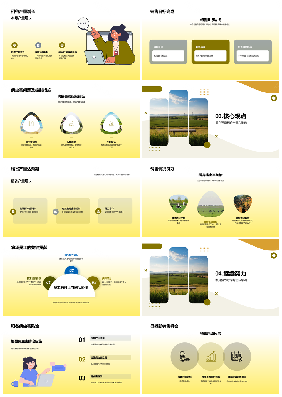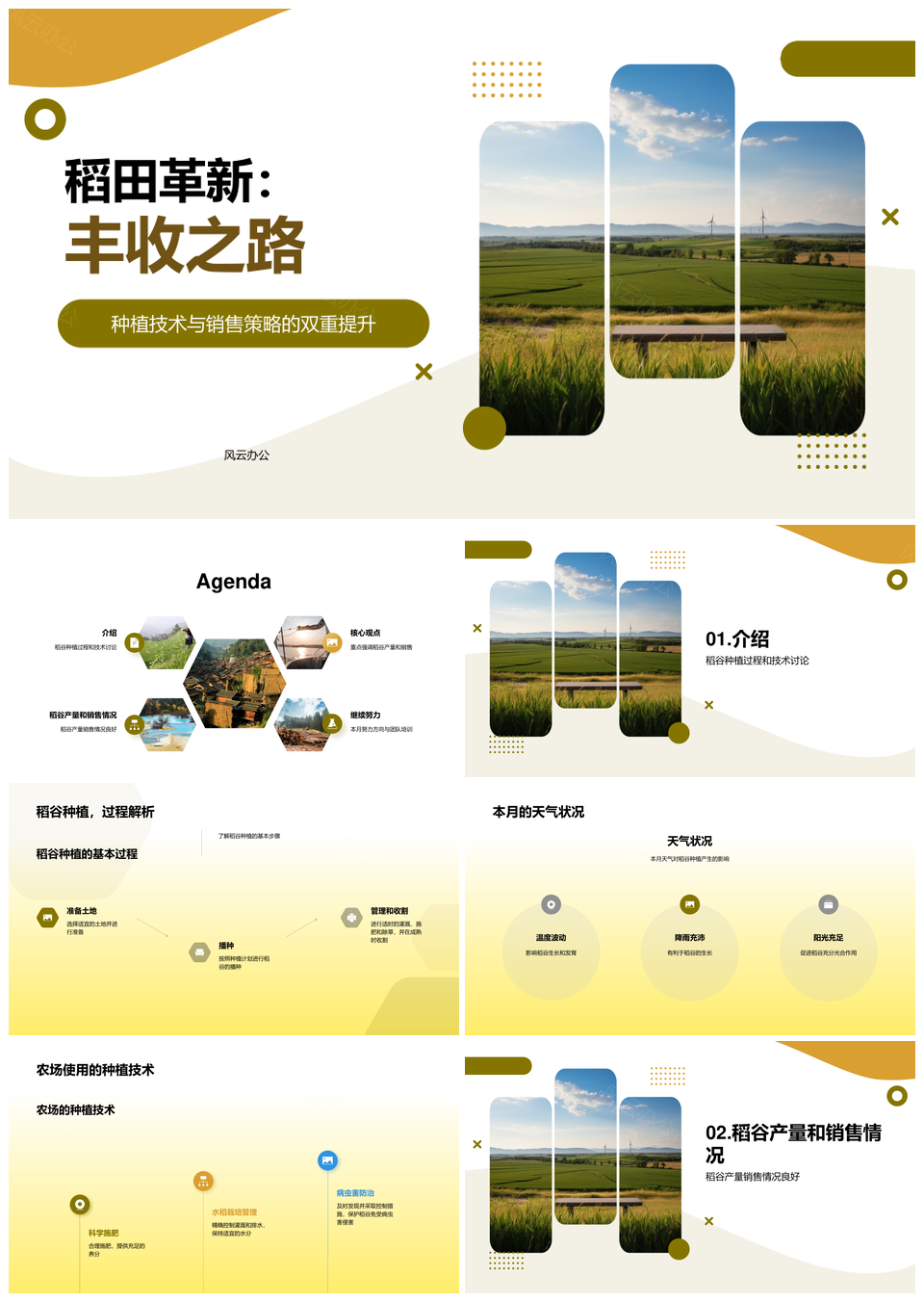 风云办公提供的稻谷种植技术革新与农场经营丰收总结PPT模板,下载格式为pptx,一共19页,作品中文字及图均可以修改和编辑,图片更改请在作品中右键图片并更换,文字修改请直接点击文字进行修改。