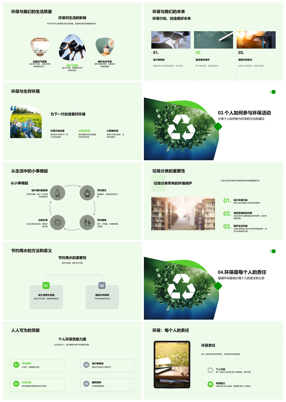 这是一张环保个人参与分类回收守护未来生存环境PPT模板,包含环保、个人、参与、分类、回收、守护、未来、生存、环境等主题内容,也可用作环保个人参与分类回收、个人参与分类回收守护、参与分类回收守护未来、分类回收守护未来生存环境、环保个人参与分类、个人参与分类回收、参与分类回收守护、分类回收守护未来、回收守护未来生存环境、环保个人参与、个人参与分类、参与分类回收、分类回收守护、回收守护未来、守护未来生存环境等PPT场景使用。 风云办公提供的环保个人参与分类回收守护未来生存环境PPT模板,下载格式为pptx,一共23页,作品中文字及图均可以修改和编辑,图片更改请在作品中右键图片并更换,文字修改请直接点击文字进行修改。