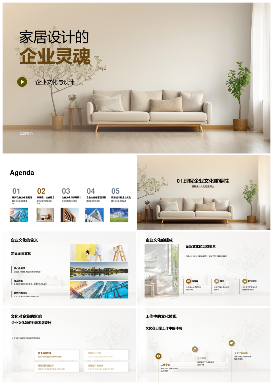 风云办公提供的家居企业文化设计理念风格品质竞争力PPT模板,下载格式为pptx,一共33页,作品中文字及图均可以修改和编辑,图片更改请在作品中右键图片并更换,文字修改请直接点击文字进行修改。