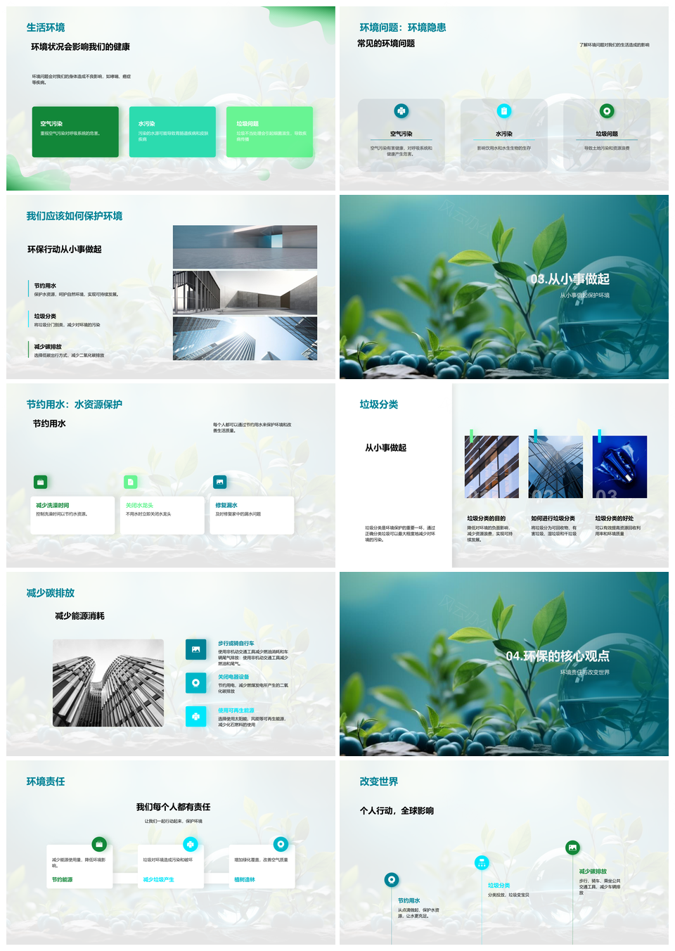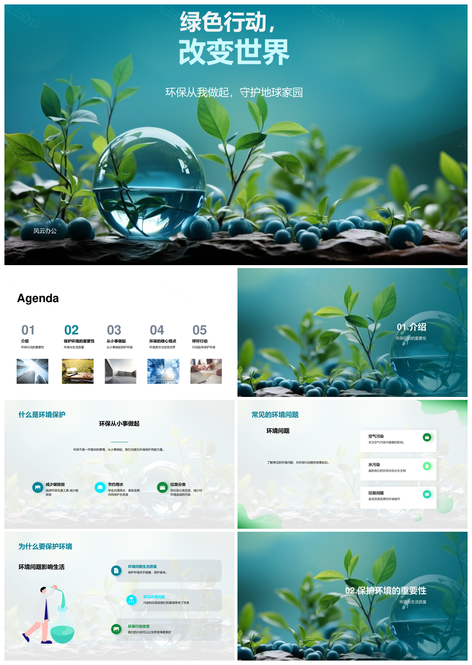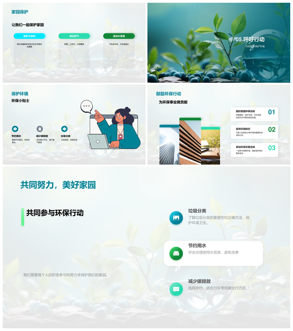 这是一张环保行动守护健康绿色家园PPT模板,包含环保行动、守护、健康、绿色家园等主题内容,也可用作环保行动守护健康、行动守护健康绿色、守护健康绿色家园、环保行动守护、行动守护健康、守护健康绿色、健康绿色家园、环保守护健康、行动健康绿色、环保健康绿色、环保行动、守护健康、健康绿色、绿色家园、环保健康等PPT场景使用。 风云办公提供的环保行动守护健康绿色家园PPT模板,下载格式为pptx,一共23页,作品中文字及图均可以修改和编辑,图片更改请在作品中右键图片并更换,文字修改请直接点击文字进行修改。