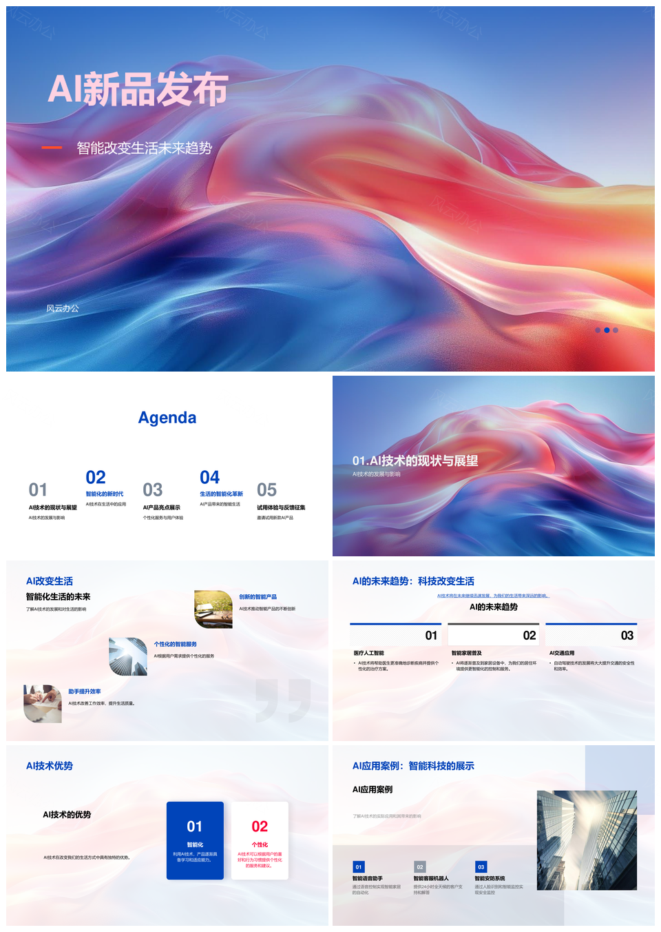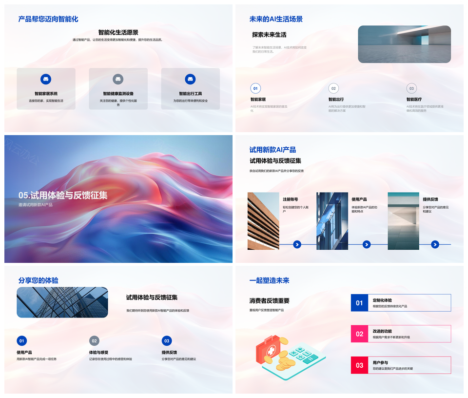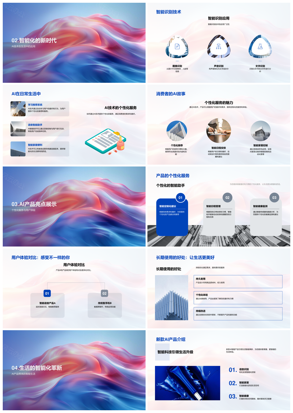 这是一张AI新品智领未来智能识别个性服务体验PPT模板,包含AI、新品、智领、未来、智能、识别、个性、服务、体验等主题内容,也可用作AI新品智领未来智能识别、智领未来智能识别个性服务、智能识别个性服务体验、智领未来智能服务体验、AI新品智能识别个性、新品智领未来智能识别、AI智领未来智能识别、智领未来智能个性服务、智领未来智能识别服务、智能识别服务体验、个性服务智领未来体验、AI新品智领未来、智能个性服务体验、智领未来个性服务、AI新品智能服务等PPT场景使用。 风云办公提供的AI新品智领未来智能识别个性服务体验PPT模板,下载格式为pptx,一共24页,作品中文字及图均可以修改和编辑,图片更改请在作品中右键图片并更换,文字修改请直接点击文字进行修改。